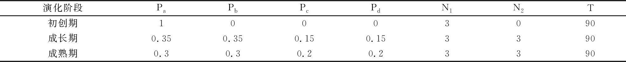 鉴于创新生态网络具有无标度特性(徐敏等,2017),本研究假定初始生态网络存在无标度特性,即初始网络联结机制按照BA无标度网络规则构建。在3个演化阶段,各创新主体间关系使用不同的邻接矩阵表示,初始网络节点数为3,每个阶段演化90个周期,演化的3个阶段分别以不同概率选择任一规则[28]:①点的新增,即以概率Pa选择加点,再随机选取N1个度较大的点与其连接;②边的新增,即以概率Pb选择加边,在已有节点中随机选取一个节点,再随机选取N2个节点与其连接;③点的删除,即以概率Pc选择删点,在已有节点中找出度最小的点,删去与其所有的连边;④边的删除,即以概率Pd选择删边,在已有节点中找出度最小的点,随机选择一条与其相连的边删去,其中,Pa+Pb+Pc+Pd=1。采用T表示演化周期,每个阶段各演化90个周期,具体参数设置见表2。