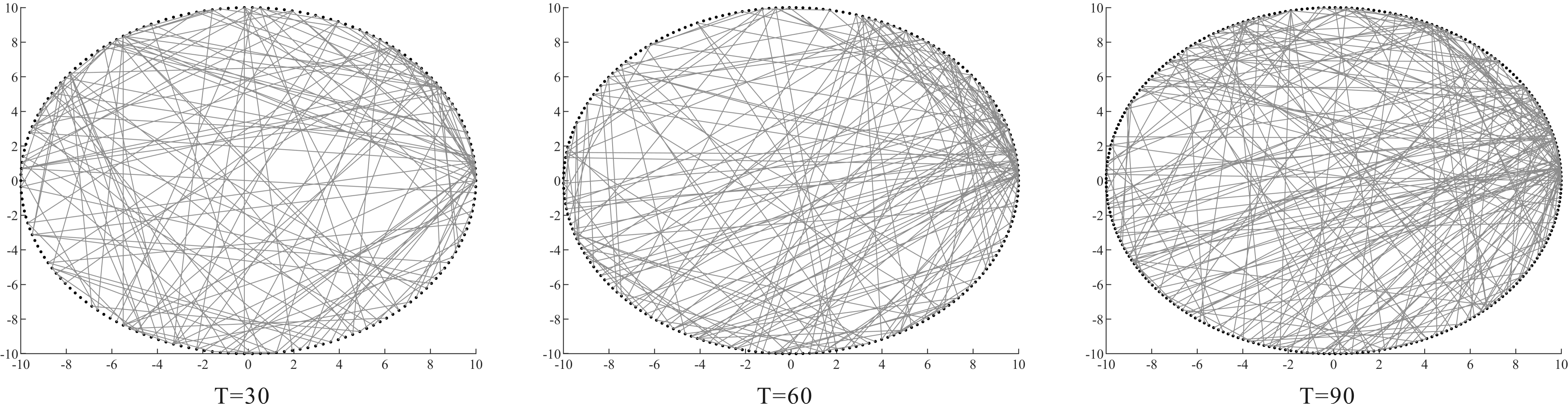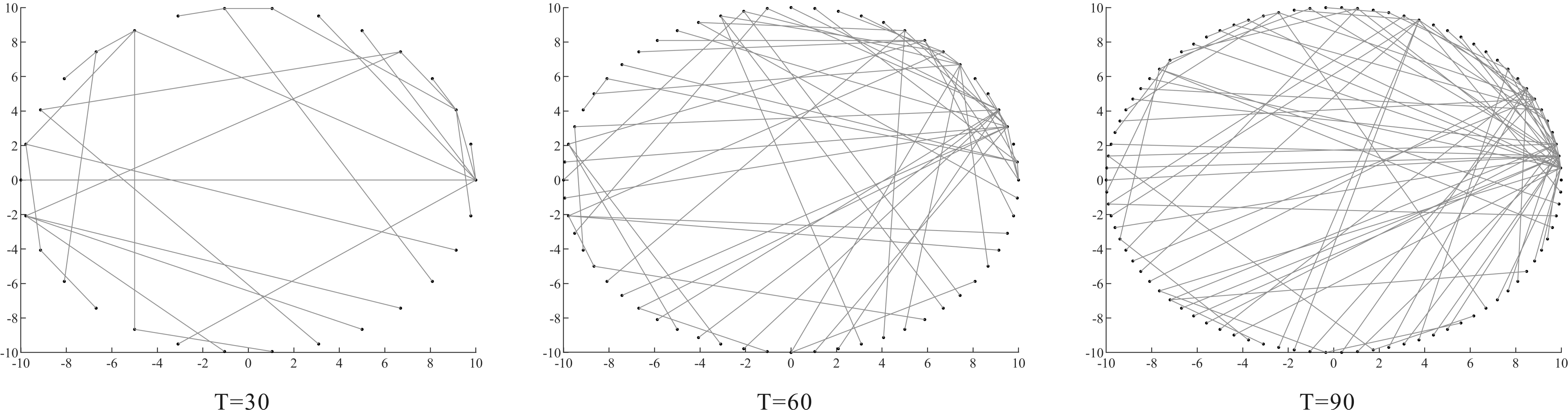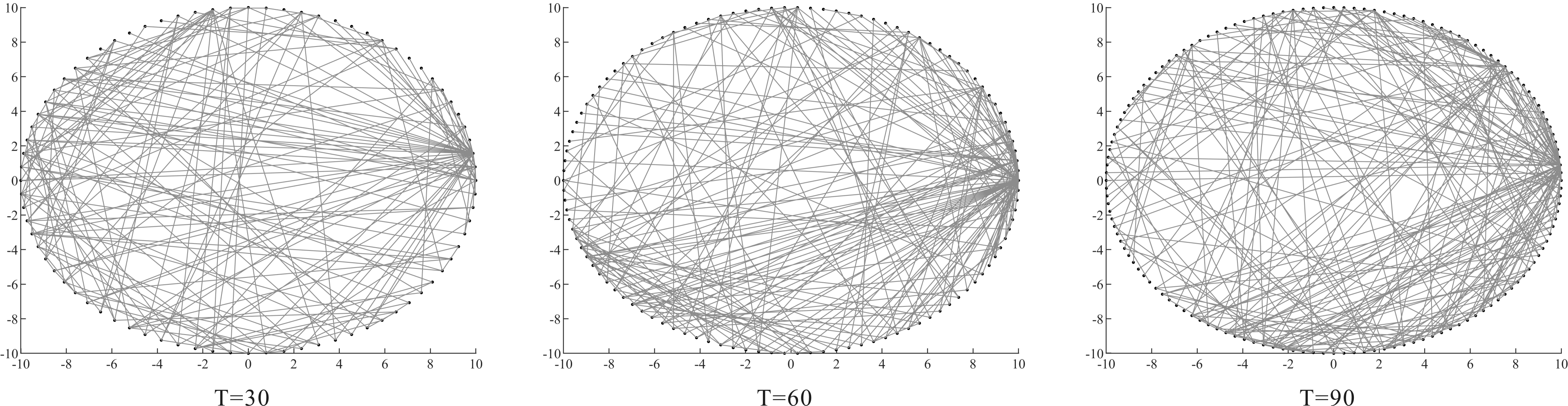 通过网络演化图分别呈现生态系统3个阶段的演化过程,具体步骤如下:采用Matlab软件对模型进行仿真,初始网络按照BA无标度网络构建规则进行初始化,按照上述步骤与算法进行模拟仿真,输出可视化仿真结果。为了降低仿真实验数据的波动性和误差,本文以同一组参数重复运算10次的平均值作为最终仿真结果。开放式创新生态系统初创期、成长期、成熟期3个阶段演化网络如图5~7所示,网络中的节点代表创新个体,连线代表创新个体之间的协作共生关系,每个阶段演化90个周期。