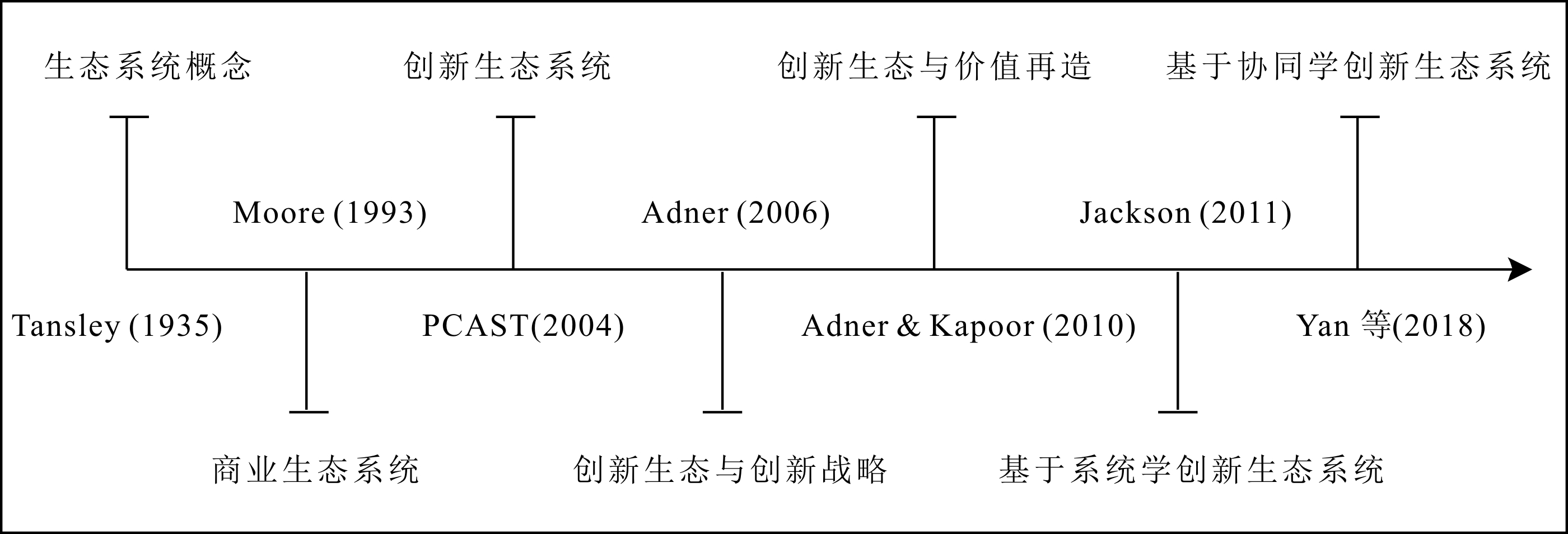 创新生态系统理论(Innovation ecosystem)源于学界对生态系统(Ecosystem)的研究,可追溯到英国生态学家Tansley对生态系统概念的界定。Tansley[8]认为,生态系统是指在特定地点、由生物和相关联的物理环境共同组成的、具有开放性的社群或集合体,需要与外界不断进行物质、能量交换和信息传递。自此,学者们对生态系统的研究从未间断。Moore[9]对商业生态系统概念进行了界定,即在商业生态系统中,企业不再是单个产业成员,而是横跨多个产业商业生态系统的一部分,它们以研发新产品、满足客户需求为目的,通过合作与竞争的方式共同发展,提升创新能力。此后,生态系统思想被广泛应用于工业、技术、管理、组织科学等领域。创新生态系统一词在2004年于美国总统科技顾问委员(PCAST)研究报告《维护国家的创新生态体系》中被首次提出,自此创新生态系统研究逐渐成为理论界和产业界研究热点,创新生态系统演进轨迹如图1所示。