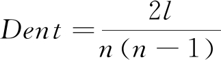 (2)生态网络密度(Eco-network density):生态网络中实际联结数与可能联结数之比,决定信息与知识扩散速率和范围,能够反映创新生态网络中创新主体之间互动联系程度。采用Dent表示,取值范围为[0,1],取值越大,密度越高。参考张鹏程等(2016)的研究,生态网络密度计算公式如式(1)所示。其中,l表示群落中实际存在的联系数量,n表示群落中总的节点(创新个体)数量,即 l=|E|,n=|V|。