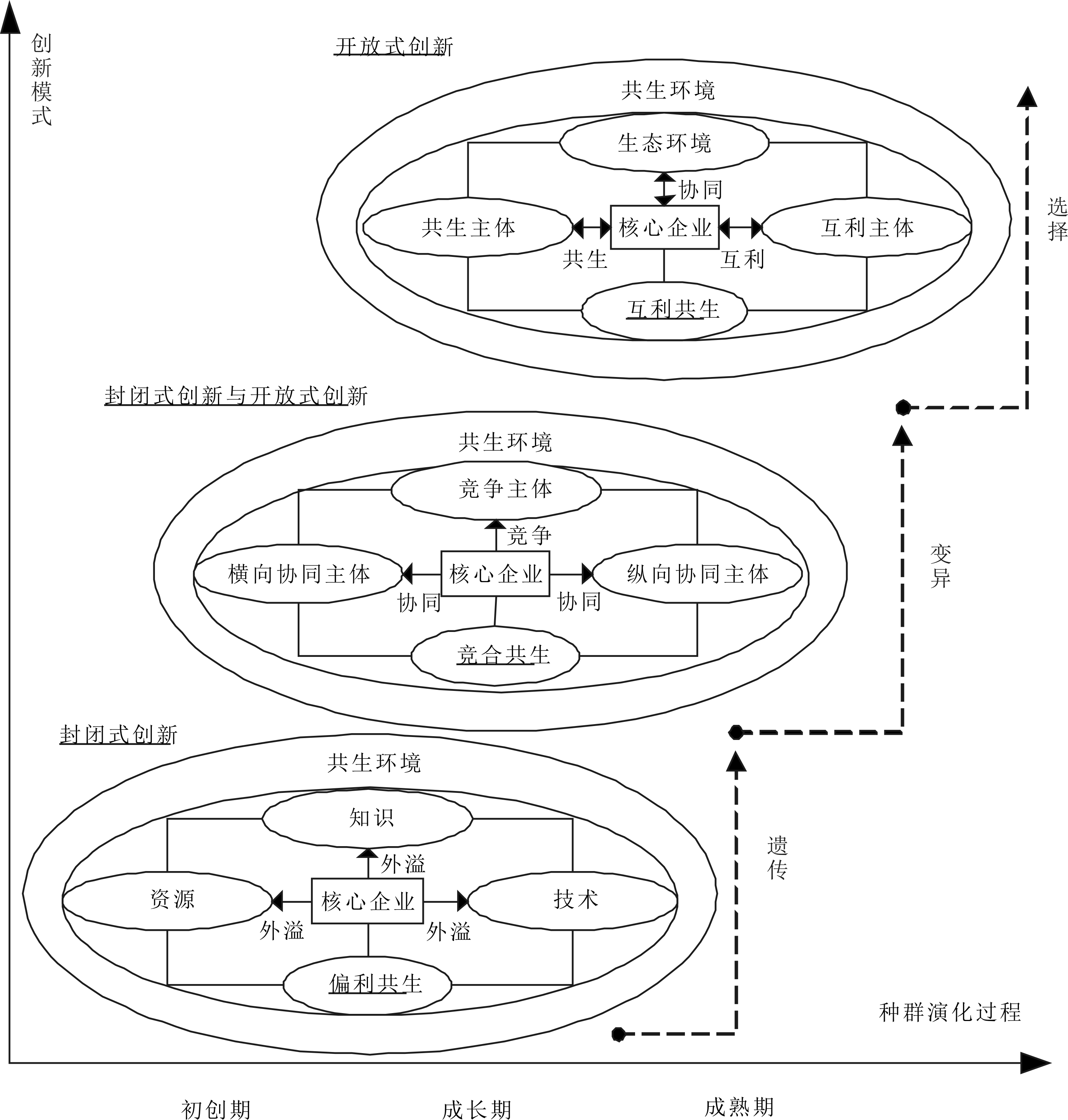 在开放式创新生态系统成长期,随着创新生态成员不断加入,系统规模逐步扩大,核心企业试图打造资源开放共享的生态体系,创新主体间互动增多。在市场环境下,各生态主体试图通过打破原有惯例产生新知识以获取新的资源和技术,系统内部自组织性逐渐提升,呈现从无序趋于有序的状态。此阶段演化特征如下:图4中箭头仍为单向,由核心企业指向其它竞争或协同主体;典型特征是各创新主体产生变异(Variation),通过技术变异、商业模式变异、市场变异等方式打破原有惯例,产生新知识、新技术、新模式[23]。因此,该阶段种群间存在竞合共生关系,一方面体现为在有限空间内争夺有限资源而互相抑制,另一方面表现为与上下游企业的纵向协同以及与其它主体构成的横向协同等。
