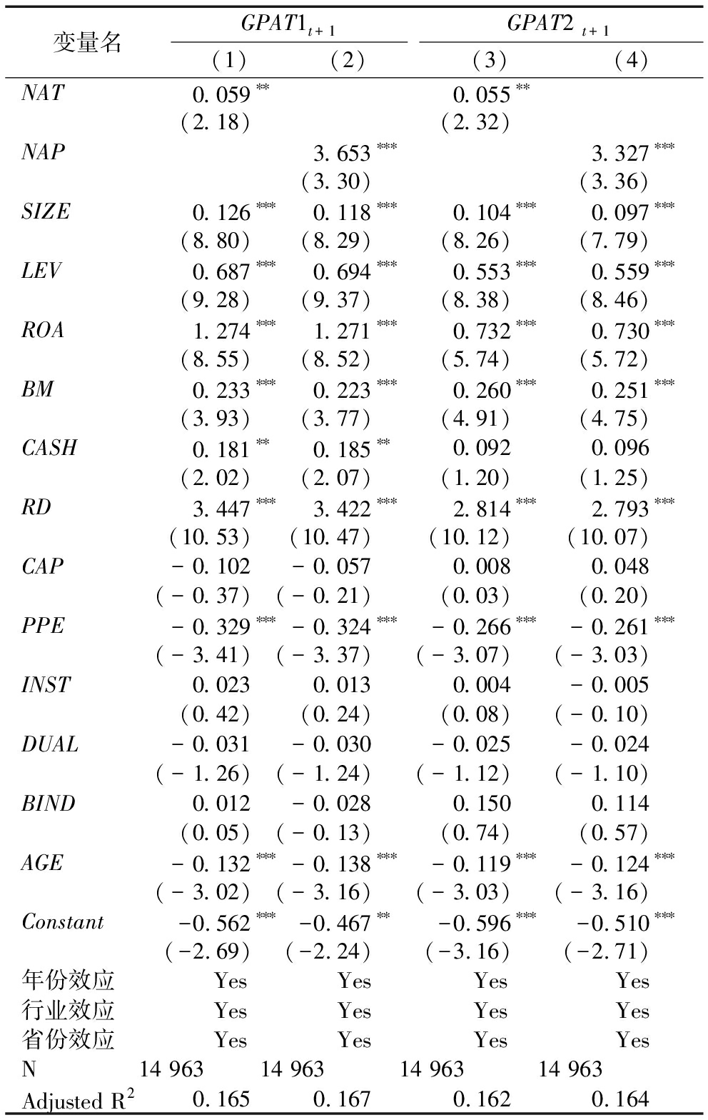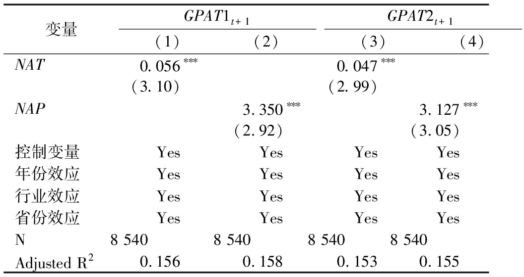 变量GPAT1t+1(1)(2)GPAT2t+1(3)(4)NAT0.056∗∗∗0.047∗∗∗(3.10)(2.99)NAP3.350∗∗∗3.127∗∗∗(2.92)(3.05)控制变量YesYesYesYes年份效应YesYesYesYes行业效应YesYesYesYes省份效应YesYesYesYesN8 5408 5408 5408 540Adjusted R20.1560.1580.1530.155