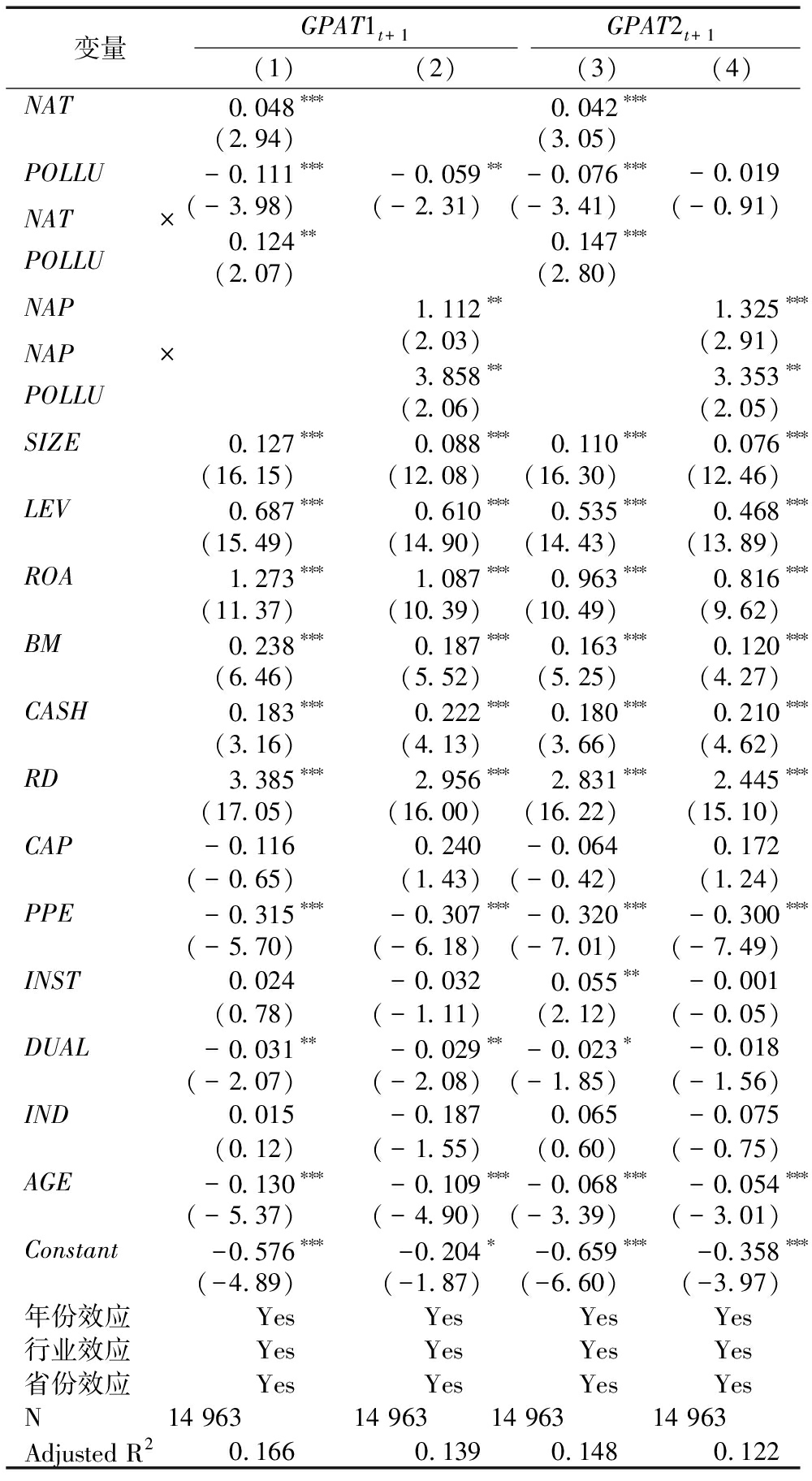 变量GPAT1t+1(1)(2)GPAT2t+1(3)(4)NAT0.048∗∗∗0.042∗∗∗(2.94)(3.05)POLLU-0.111∗∗∗-0.059∗∗-0.076∗∗∗-0.019(-3.98)(-2.31)(-3.41)(-0.91)NAT×POLLU0.124∗∗0.147∗∗∗(2.07)(2.80)NAP1.112∗∗1.325∗∗∗(2.03)(2.91)NAP×POLLU3.858∗∗3.353∗∗(2.06)(2.05)SIZE0.127∗∗∗0.088∗∗∗0.110∗∗∗0.076∗∗∗(16.15)(12.08)(16.30)(12.46)LEV0.687∗∗∗0.610∗∗∗0.535∗∗∗0.468∗∗∗(15.49)(14.90)(14.43)(13.89)ROA1.273∗∗∗1.087∗∗∗0.963∗∗∗0.816∗∗∗(11.37)(10.39)(10.49)(9.62)BM0.238∗∗∗0.187∗∗∗0.163∗∗∗0.120∗∗∗(6.46)(5.52)(5.25)(4.27)CASH0.183∗∗∗0.222∗∗∗0.180∗∗∗0.210∗∗∗(3.16)(4.13)(3.66)(4.62)RD3.385∗∗∗2.956∗∗∗2.831∗∗∗2.445∗∗∗(17.05)(16.00)(16.22)(15.10)CAP-0.1160.240-0.0640.172(-0.65)(1.43)(-0.42)(1.24)PPE-0.315∗∗∗-0.307∗∗∗-0.320∗∗∗-0.300∗∗∗(-5.70)(-6.18)(-7.01)(-7.49)INST0.024-0.0320.055∗∗-0.001(0.78)(-1.11)(2.12)(-0.05)DUAL-0.031∗∗-0.029∗∗-0.023∗-0.018(-2.07)(-2.08)(-1.85)(-1.56)IND0.015-0.1870.065-0.075(0.12)(-1.55)(0.60)(-0.75)AGE-0.130∗∗∗-0.109∗∗∗-0.068∗∗∗-0.054∗∗∗(-5.37)(-4.90)(-3.39)(-3.01)Constant-0.576∗∗∗-0.204∗-0.659∗∗∗-0.358∗∗∗(-4.89)(-1.87)(-6.60)(-3.97)年份效应YesYesYesYes行业效应YesYesYesYes省份效应YesYesYesYesN14 96314 96314 96314 963Adjusted R20.1660.1390.1480.122