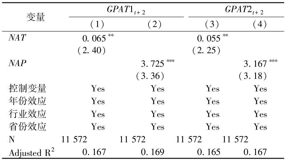 变量GPAT1t+2(1)(2)GPAT2t+2(3)(4)NAT0.065∗∗0.055∗∗(2.40)(2.25)NAP3.725∗∗∗3.167∗∗∗(3.36)(3.18)控制变量YesYesYesYes年份效应YesYesYesYes行业效应YesYesYesYes省份效应YesYesYesYesN11 57211 57211 57211 572Adjusted R20.1670.1690.1650.167