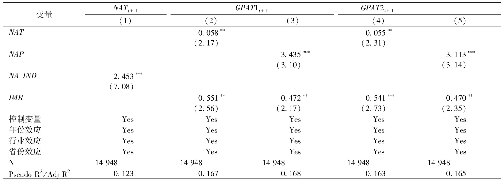 变量NATt+1(1)GPAT1t+1(2)(3)GPAT2t+1(4)(5)NAT0.058∗∗0.055∗∗(2.17)(2.31)NAP3.435∗∗∗3.113∗∗∗(3.10)(3.14)NA_IND2.453∗∗∗(7.08)IMR0.551∗∗0.472∗∗0.541∗∗∗0.470∗∗(2.56)(2.17)(2.73)(2.35)控制变量YesYesYesYesYes年份效应YesYesYesYesYes行业效应YesYesYesYesYes省份效应YesYesYesYesYesN14 94814 94814 94814 94814 948Pseudo R2/Adj R20.1230.1670.1680.1630.165