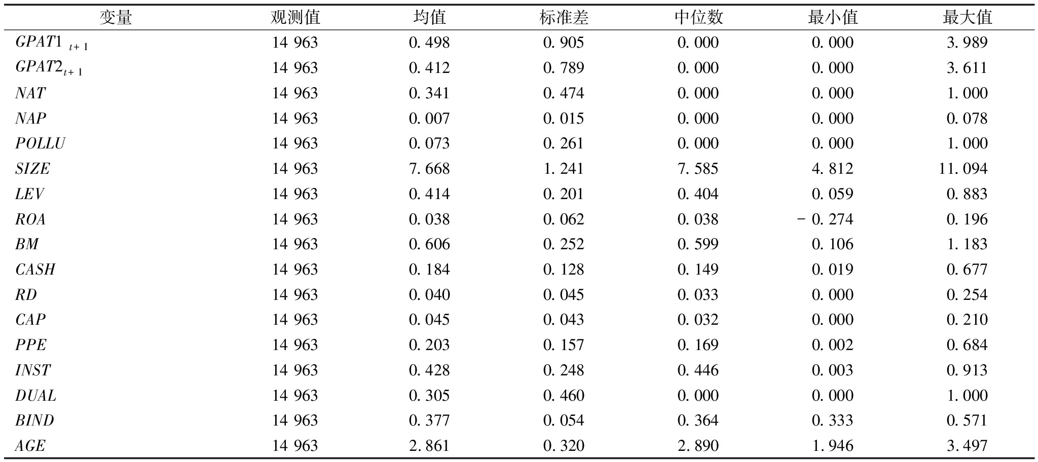 变量观测值均值标准差中位数最小值最大值GPAT1 t+114 9630.4980.9050.0000.0003.989GPAT2 t+114 9630.4120.7890.0000.0003.611NAT14 9630.3410.4740.0000.0001.000NAP14 9630.0070.0150.0000.0000.078POLLU14 9630.0730.2610.0000.0001.000SIZE14 9637.6681.2417.5854.81211.094LEV14 9630.4140.2010.4040.0590.883ROA14 9630.0380.0620.038-0.2740.196BM14 9630.6060.2520.5990.1061.183CASH14 9630.1840.1280.1490.0190.677RD14 9630.0400.0450.0330.0000.254CAP14 9630.0450.0430.0320.0000.210PPE14 9630.2030.1570.1690.0020.684INST14 9630.4280.2480.4460.0030.913DUAL14 9630.3050.4600.0000.0001.000BIND14 9630.3770.0540.3640.3330.571AGE14 9632.8610.3202.8901.9463.497