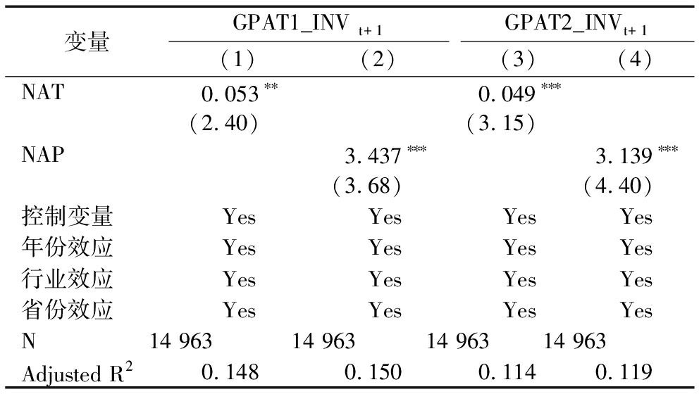 变量GPAT1_INV t+1(1)(2)GPAT2_INVt+1(3)(4)NAT0.053∗∗0.049∗∗∗(2.40)(3.15)NAP3.437∗∗∗3.139∗∗∗(3.68)(4.40)控制变量YesYesYesYes年份效应YesYesYesYes行业效应YesYesYesYes省份效应YesYesYesYesN14 96314 96314 96314 963Adjusted R20.1480.1500.1140.119