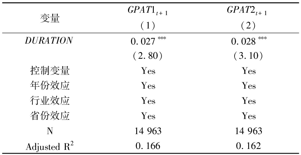 变量GPAT1t+1GPAT2t+1(1)(2)DURATION0.027∗∗∗0.028∗∗∗(2.80)(3.10)控制变量YesYes年份效应YesYes行业效应YesYes省份效应YesYesN14 96314 963Adjusted R20.1660.162