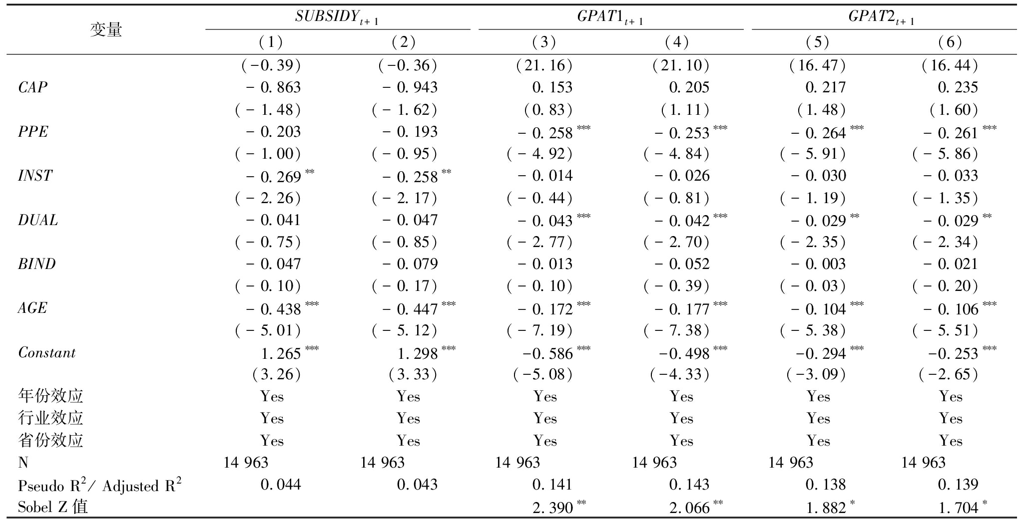 变量SUBSIDYt+1(1)(2)GPAT1t+1(3)(4)GPAT2t+1(5)(6)(-0.39)(-0.36)(21.16)(21.10)(16.47)(16.44)CAP-0.863-0.9430.1530.2050.2170.235(-1.48)(-1.62)(0.83)(1.11)(1.48)(1.60)PPE-0.203-0.193-0.258∗∗∗-0.253∗∗∗-0.264∗∗∗-0.261∗∗∗(-1.00)(-0.95)(-4.92)(-4.84)(-5.91)(-5.86)INST-0.269∗∗-0.258∗∗-0.014-0.026-0.030-0.033(-2.26)(-2.17)(-0.44)(-0.81)(-1.19)(-1.35)DUAL-0.041-0.047-0.043∗∗∗-0.042∗∗∗-0.029∗∗-0.029∗∗(-0.75)(-0.85)(-2.77)(-2.70)(-2.35)(-2.34)BIND-0.047-0.079-0.013-0.052-0.003-0.021(-0.10)(-0.17)(-0.10)(-0.39)(-0.03)(-0.20)AGE-0.438∗∗∗-0.447∗∗∗-0.172∗∗∗-0.177∗∗∗-0.104∗∗∗-0.106∗∗∗(-5.01)(-5.12)(-7.19)(-7.38)(-5.38)(-5.51)Constant1.265∗∗∗1.298∗∗∗-0.586∗∗∗-0.498∗∗∗-0.294∗∗∗-0.253∗∗∗(3.26)(3.33)(-5.08)(-4.33)(-3.09)(-2.65)年份效应YesYesYesYesYesYes行业效应YesYesYesYesYesYes省份效应YesYesYesYesYesYesN14 96314 96314 96314 96314 96314 963Pseudo R2/ Adjusted R20.0440.0430.1410.1430.1380.139Sobel Z值2.390∗∗2.066∗∗1.882∗1.704∗