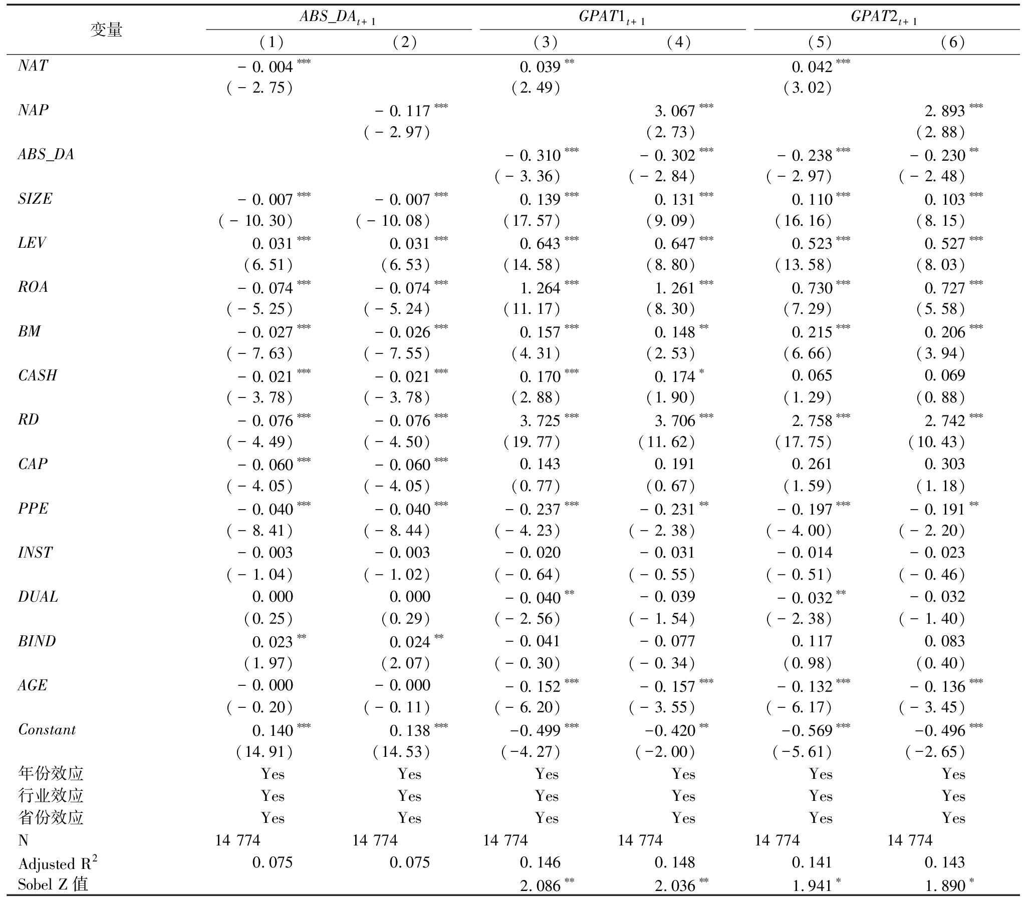 变量ABS_DAt+1(1)(2)GPAT1t+1(3)(4)GPAT2t+1(5)(6)NAT-0.004∗∗∗0.039∗∗0.042∗∗∗(-2.75)(2.49)(3.02)NAP-0.117∗∗∗3.067∗∗∗2.893∗∗∗(-2.97)(2.73)(2.88)ABS_DA-0.310∗∗∗-0.302∗∗∗-0.238∗∗∗-0.230∗∗(-3.36)(-2.84)(-2.97)(-2.48)SIZE-0.007∗∗∗-0.007∗∗∗0.139∗∗∗0.131∗∗∗0.110∗∗∗0.103∗∗∗(-10.30)(-10.08)(17.57)(9.09)(16.16)(8.15)LEV0.031∗∗∗0.031∗∗∗0.643∗∗∗0.647∗∗∗0.523∗∗∗0.527∗∗∗(6.51)(6.53)(14.58)(8.80)(13.58)(8.03)ROA-0.074∗∗∗-0.074∗∗∗1.264∗∗∗1.261∗∗∗0.730∗∗∗0.727∗∗∗(-5.25)(-5.24)(11.17)(8.30)(7.29)(5.58)BM-0.027∗∗∗-0.026∗∗∗0.157∗∗∗0.148∗∗0.215∗∗∗0.206∗∗∗(-7.63)(-7.55)(4.31)(2.53)(6.66)(3.94)CASH-0.021∗∗∗-0.021∗∗∗0.170∗∗∗0.174∗0.0650.069(-3.78)(-3.78)(2.88)(1.90)(1.29)(0.88)RD-0.076∗∗∗-0.076∗∗∗3.725∗∗∗3.706∗∗∗2.758∗∗∗2.742∗∗∗(-4.49)(-4.50)(19.77)(11.62)(17.75)(10.43)CAP-0.060∗∗∗-0.060∗∗∗0.1430.1910.2610.303(-4.05)(-4.05)(0.77)(0.67)(1.59)(1.18)PPE-0.040∗∗∗-0.040∗∗∗-0.237∗∗∗-0.231∗∗-0.197∗∗∗-0.191∗∗(-8.41)(-8.44)(-4.23)(-2.38)(-4.00)(-2.20)INST-0.003-0.003-0.020-0.031-0.014-0.023(-1.04)(-1.02)(-0.64)(-0.55)(-0.51)(-0.46)DUAL0.0000.000-0.040∗∗-0.039-0.032∗∗-0.032(0.25)(0.29)(-2.56)(-1.54)(-2.38)(-1.40)BIND0.023∗∗0.024∗∗-0.041-0.0770.1170.083(1.97)(2.07)(-0.30)(-0.34)(0.98)(0.40)AGE-0.000-0.000-0.152∗∗∗-0.157∗∗∗-0.132∗∗∗-0.136∗∗∗(-0.20)(-0.11)(-6.20)(-3.55)(-6.17)(-3.45)Constant0.140∗∗∗0.138∗∗∗-0.499∗∗∗-0.420∗∗-0.569∗∗∗-0.496∗∗∗(14.91)(14.53)(-4.27)(-2.00)(-5.61)(-2.65)年份效应YesYesYesYesYesYes行业效应YesYesYesYesYesYes省份效应YesYesYesYesYesYesN14 77414 77414 77414 77414 77414 774Adjusted R20.0750.0750.1460.1480.1410.143Sobel Z值2.086∗∗2.036∗∗1.941∗1.890∗