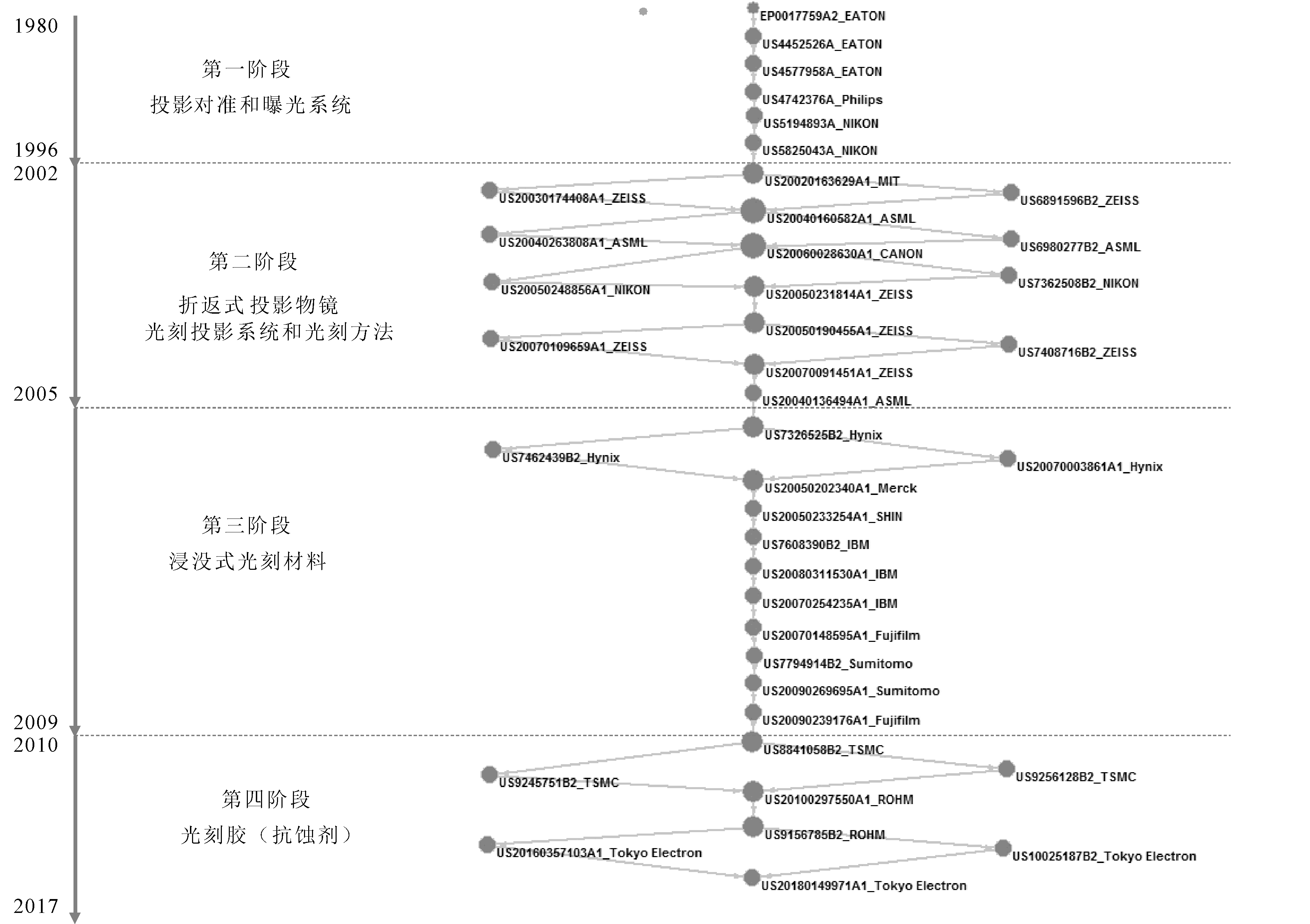 第一阶段(1980-1996年),步进式光刻技术日趋成熟,但主导主路径的市场竞争主体仅有EATON、飞利浦和尼康3家公司,直到下一个颠覆性技术在2002年出现,期间未有新关键技术出现在主路径中,旧有步进式光刻路径逐渐被取代,同时也是干式光刻技术逐渐消解的过程;2002年前后,摩尔定律接近物理极限,传统193nm干式光刻未将工艺节点推进至65nm以下,尼康和佳能研发的157nm光刻机难以实现突破,ASML将具有颠覆意义的浸没式光刻机推向市场[3],从此出现新技术方向——浸没光刻。因此,第二、三阶段出现与浸没式光刻相关的新专利技术,如折返式投影技术和浸没光刻材料等;第三阶段技术发展出现路径依赖,伴随着工艺节点需求的提升,要求企业在分辨率、浸没液体和光刻胶等方面不断进步;第四阶段光刻胶技术路径逐渐分化,伴随着旧有路径的消解,EUV光刻胶出现在主路径中。