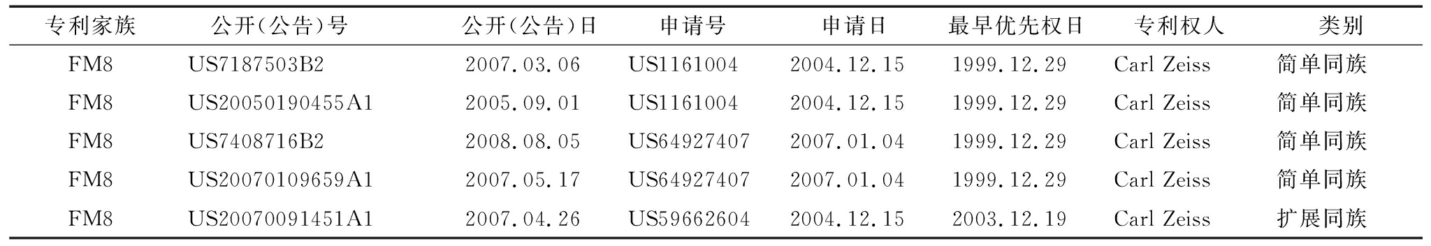 专利家族 公开(公告)号公开(公告)日申请号申请日最早优先权日专利权人类别FM8US7187503B22007.03.06US11610042004.12.151999.12.29Carl Zeiss 简单同族FM8US20050190455A12005.09.01US11610042004.12.151999.12.29Carl Zeiss 简单同族FM8US7408716B22008.08.05US649274072007.01.041999.12.29Carl Zeiss 简单同族FM8US20070109659A12007.05.17US649274072007.01.041999.12.29Carl Zeiss 简单同族FM8US20070091451A12007.04.26US596626042004.12.152003.12.19Carl Zeiss 扩展同族