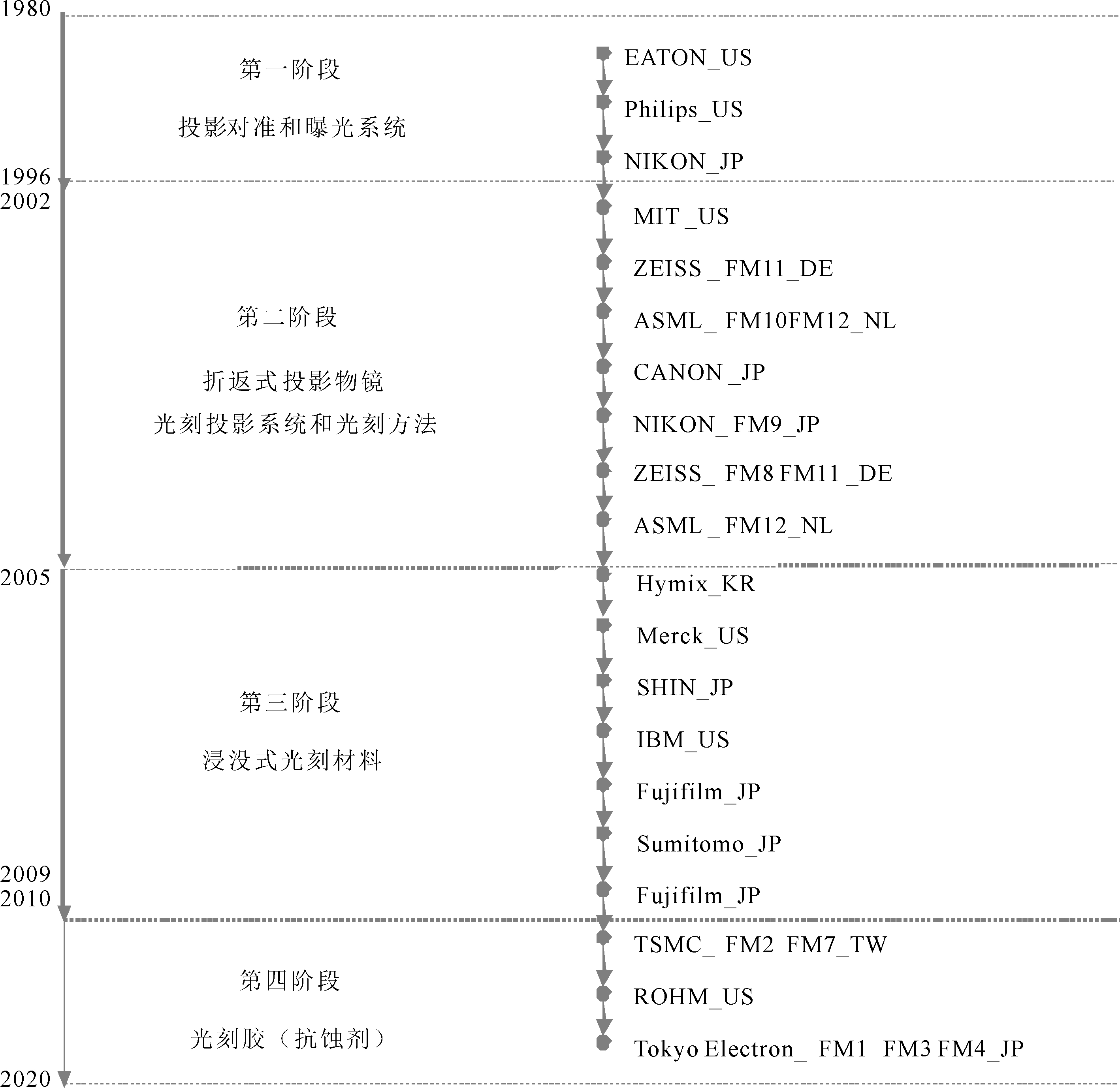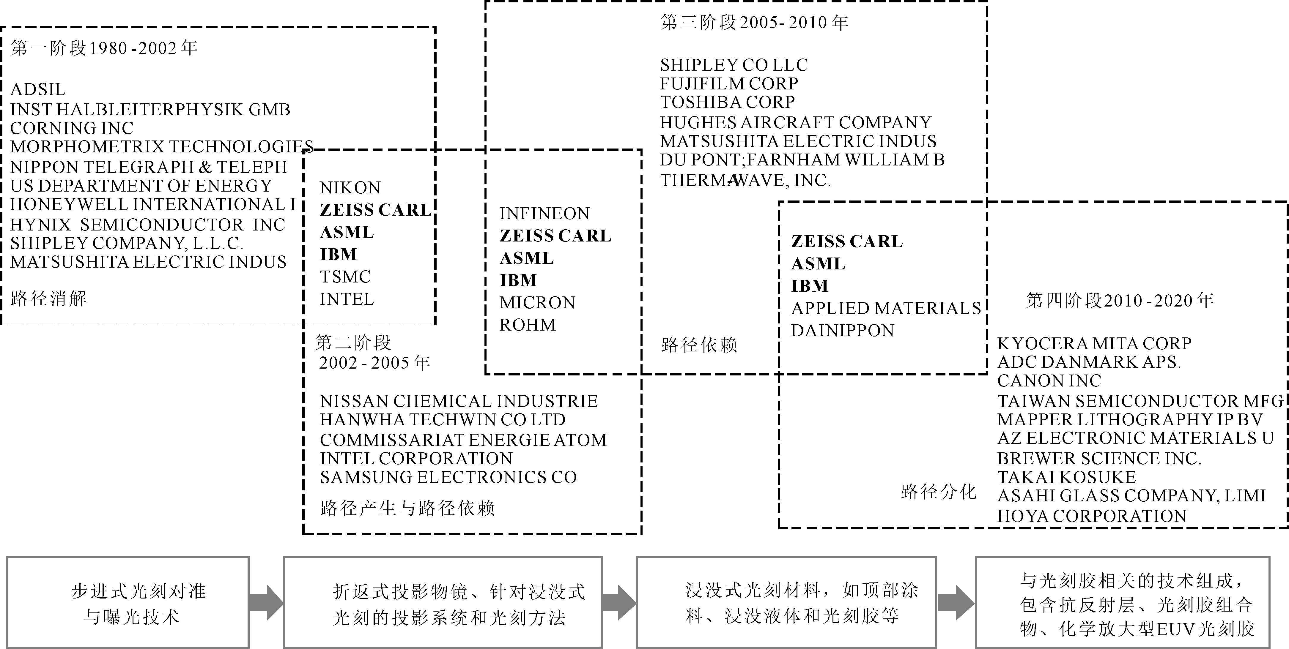 由于技术的不断突破,从第一阶段开始,步进式光刻对准与曝光路径逐渐消解,第二阶段围绕浸没式投影物镜的光刻方法逐渐产生,第三阶段技术路径主要围绕解决浸没式光刻带来的一系列问题,解决方案主要集中在浸没液、光刻胶上,进一步强化了浸没式光刻技术路径依赖,因此未将路径产生与路径依赖严格区分开来。在路径依赖的每个阶段、每个步骤都存在新选择机会,也即光刻产业发展既受浸没式路径的影响,又充满各种挑战,因此第四阶段是浸没式光刻逐渐消解与EUV技术突破的过程,其路径演化过程伴随着市场主体的更替。
