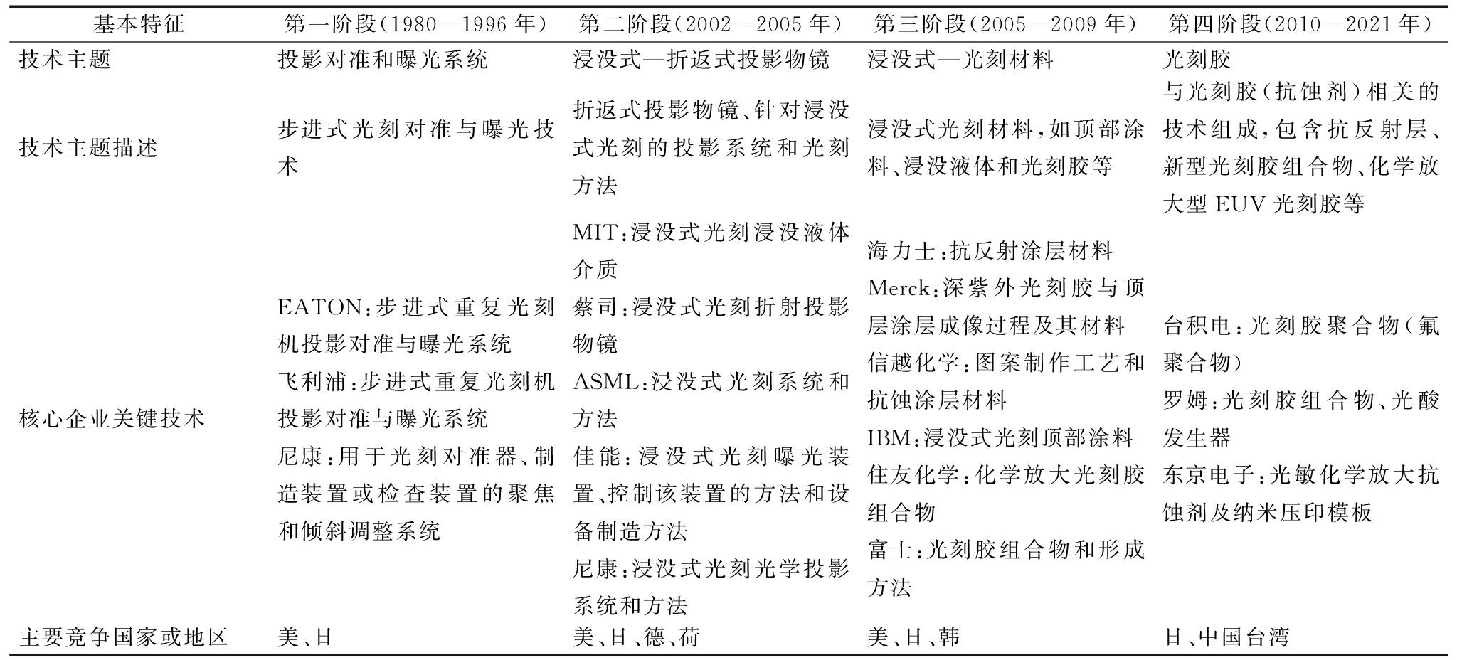 由表2可知,专利家族在时间分布上主要集中在第四阶段。结合专利权人分析可知,日本专利家族主要来自东京电子、JSR和尼康,主要围绕化学放大光刻胶(CAR)技术,说明日本在光刻胶领域的垄断地位不断提升并呈现多元化发展趋势。自20世纪末以来,半导体行业分工不断细化,日本在芯片、光刻机等生产领域逐渐丧失竞争优势,随后全面转向材料领域,光刻胶成为日本重点发展产品之一,占据全球75%的市场份额[36]。其它专利家族来自荷兰阿斯麦、中国台湾台积电、德国蔡司,这3家公司专利家族虽然属于不同国家,但专利技术均来源于美国。ASML与蔡司、台积电等公司保持着紧密的商业合作关系,本质上是一组拥有核心技术的企业联盟[37]。从某种程度上讲,光刻领域核心技术一直被ASML垄断,一旦路径发展进入稳定阶段,整个演化过程便呈现出显著的ASML联盟依赖特征,这源于增强机制和行动者的有意行为。然而,即便出现路径锁定状态,也只是演化过程中暂时的均衡,路径演化会一直持续下去[21],这点已在图6中得到印证。表3列示了主路径在不同时期的技术内容,包括每个时期的核心技术主题、核心企业关键技术及主要参与竞争国家。