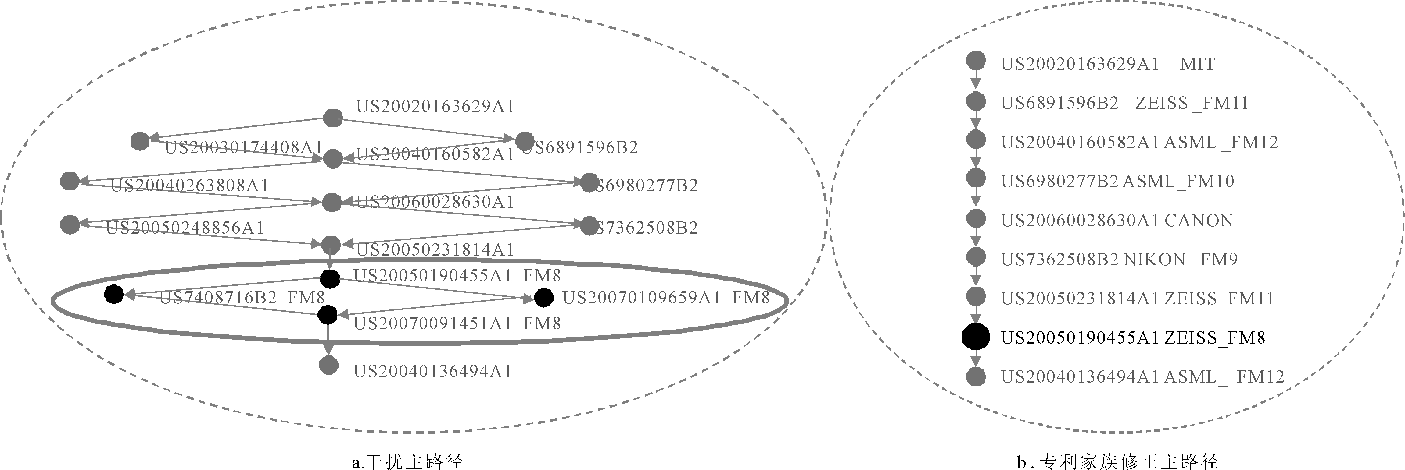 接下来,通过规范化专利申请人名称清理专利数据,如ASML HOLDING N.V.公司与ASML NETHERLANDS B.V公司同属于ASML公司,因此本文将其标记为ASML。通过比较全局搜索中的干扰主路径(图5a)和修正主路径(图5b),将修正合并后的路径视为主路径。在专利US20050231814A1之后,US20050190455A1、US7408716B2、US20070109659A1和US20070091451A1均属于同一专利家族FM8,代表浸没式光刻折射投影技术。可见,光刻投影物镜从传统干式光刻全折射式设计转变为浸没式光刻折返式设计[27]。通过观察发现,德国蔡司公司在整个技术路径中发挥主导作用,说明该公司在此阶段作出了重要贡献。