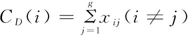 网络节点中心性主要包含度数中心性(Degree Centrality)、中介中心性(Betweenness Centrality)和接近中心性(Closeness Centrality)3个常用指标。其中,度数中心性是指某一节点链接的其它节点数,若某一节点与多个节点相连说明该节点具有较高的度数中心性,即该节点在网络中比较重要[33]。节点度数中心性计算公式为: