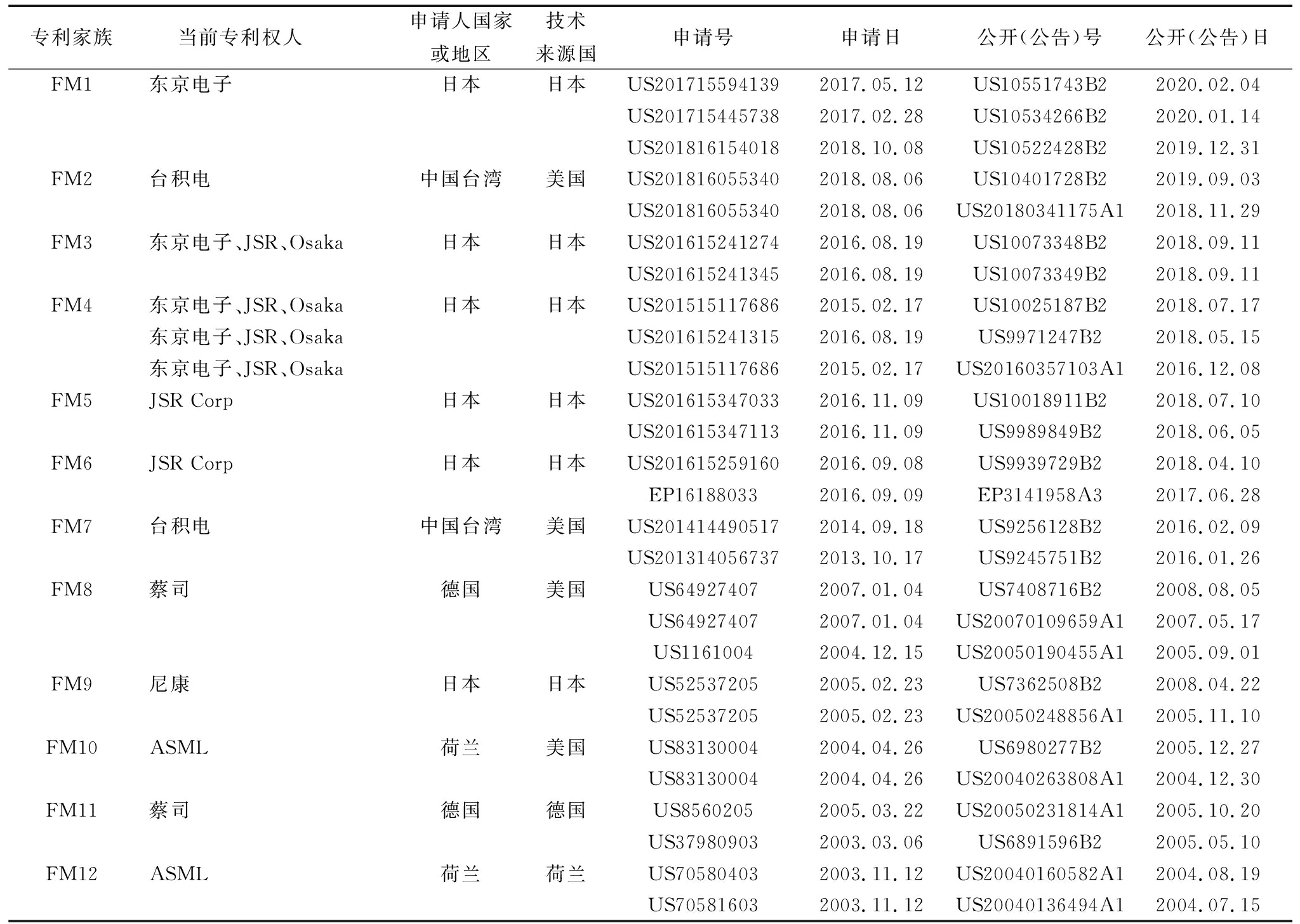 专利家族当前专利权人 申请人国家或地区技术来源国申请号申请日公开(公告)号公开(公告)日FM1东京电子日本日本US2017155941392017.05.12US10551743B22020.02.04US2017154457382017.02.28US10534266B22020.01.14US2018161540182018.10.08US10522428B22019.12.31FM2台积电中国台湾美国US2018160553402018.08.06US10401728B22019.09.03US2018160553402018.08.06US20180341175A12018.11.29FM3东京电子、JSR、Osaka 日本日本US2016152412742016.08.19US10073348B22018.09.11US2016152413452016.08.19US10073349B22018.09.11FM4东京电子、JSR、Osaka日本日本US2015151176862015.02.17US10025187B22018.07.17东京电子、JSR、OsakaUS2016152413152016.08.19US9971247B22018.05.15东京电子、JSR、OsakaUS2015151176862015.02.17US20160357103A12016.12.08FM5JSR Corp日本日本US2016153470332016.11.09US10018911B22018.07.10US2016153471132016.11.09US9989849B22018.06.05FM6JSR Corp日本日本US2016152591602016.09.08US9939729B22018.04.10EP161880332016.09.09EP3141958A32017.06.28FM7台积电中国台湾美国US2014144905172014.09.18US9256128B22016.02.09US2013140567372013.10.17US9245751B22016.01.26FM8蔡司德国美国US649274072007.01.04US7408716B22008.08.05US649274072007.01.04US20070109659A12007.05.17US11610042004.12.15US20050190455A12005.09.01FM9尼康日本日本US525372052005.02.23US7362508B22008.04.22US525372052005.02.23US20050248856A12005.11.10FM10ASML荷兰美国US831300042004.04.26US6980277B22005.12.27US831300042004.04.26US20040263808A12004.12.30FM11蔡司德国德国US85602052005.03.22US20050231814A12005.10.20US379809032003.03.06US6891596B22005.05.10FM12ASML 荷兰荷兰US705804032003.11.12US20040160582A12004.08.19US705816032003.11.12US20040136494A12004.07.15