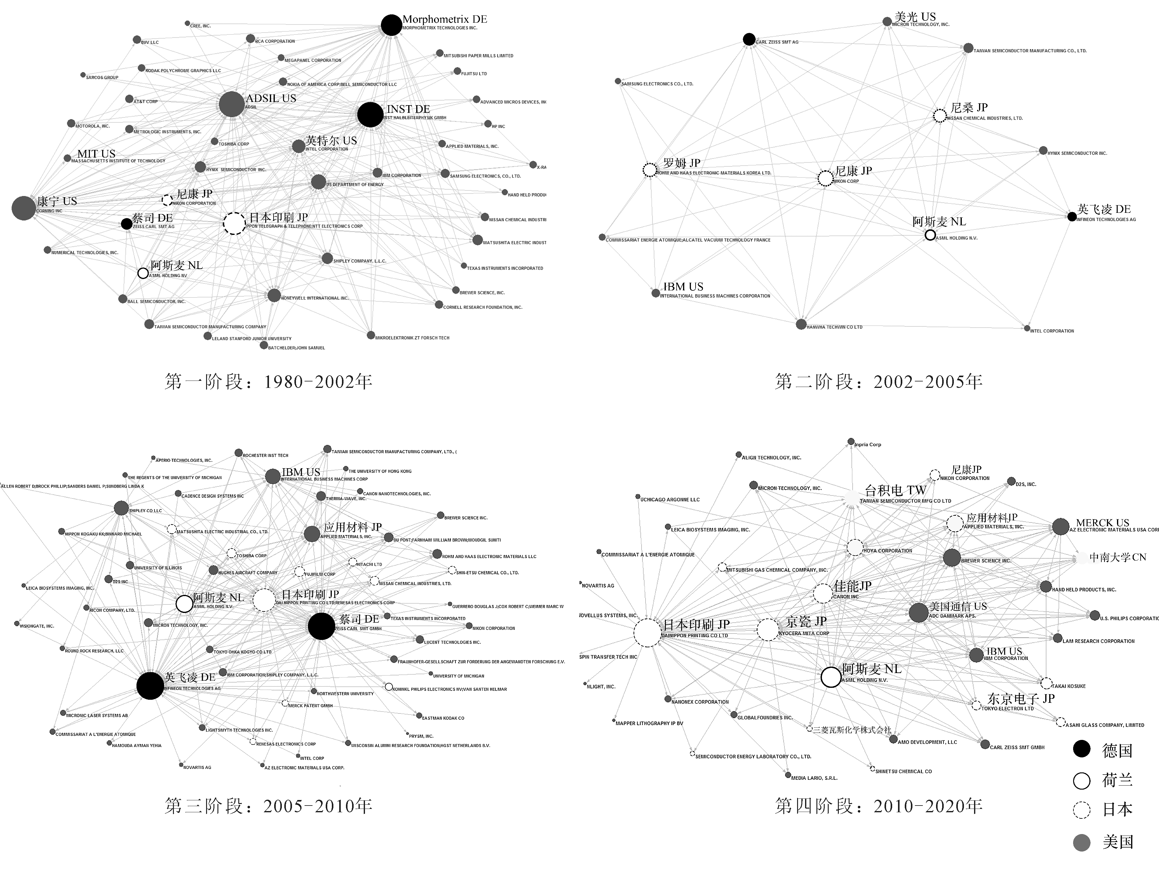 主路径仅代表核心技术发展演化轨迹,本文通过绘制知识流动引文网络分析每个阶段的专利权人特征。为完整展现光刻技术发展历程,依据主路径划分的4个阶段对专利数据进行收集,研究不同阶段光刻专利权人的专利引用网络(知识流动网络),通过专利权人网络位置分析其所扮演的角色,如图7所示。图中每个专利节点代表一个专利权人,节点大小代表该专利权人的中心度,较高度数中心性意味着更高的知识水平。在网络形成阶段,企业比较重视探索式创新,因此节点度高的企业拥有更多相互连接的合作伙伴,从而拥有更多的多样化、非冗余信息[38]。箭头从知识来源指向接受者,并在专利权人后面标注了专利权人所在国家。从图7可以看出,德国(黑色圆点)和美国(灰色圆点)在第一阶段占据网络核心位置,具有先发优势,荷兰(实线空心圆点)和日本(虚线空心圆点)从第二阶段逐渐占据主导地位。总体来看,美日德及其它国家或地区专利权人在知识流动网络中的联系较为紧密。