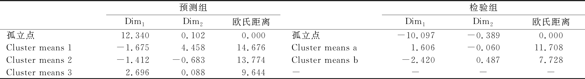 预测组Dim1Dim2欧氏距离检验组Dim1Dim2欧氏距离孤立点12.3400.1020.000孤立点-10.097-0.3890.000Cluster means 1-1.6754.45814.676Cluster means a1.606-0.06011.708Cluster means 2-1.412-0.68313.774Cluster means b-2.4200.4877.728Cluster means 32.6960.0889.644----