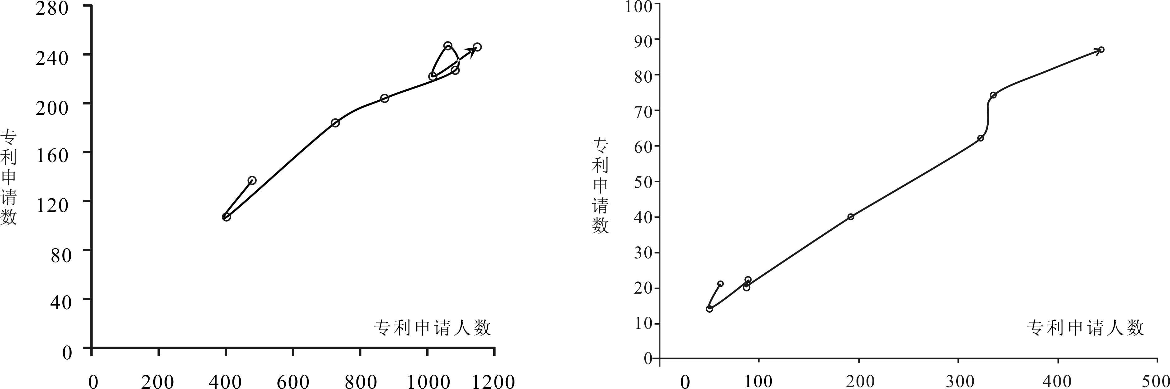 图8~图10分别为预测组第一、二、三类技术生命周期曲线,横、纵坐标轴分别代表2008-2015年专利申请人数和专利申请数。从图8可以看出,去除特定污染物技术(第一类技术)处于第四阶段,曲线端点位置表明专利申请人数和专利申请数已降至最低水平,说明该技术已被淘汰,验证了上文静态预测结果。这是因为,去除某种特定污染物技术适用范围较小,随着人类生产生活方式逐渐向清洁生产与消费模式转变,废水有害化合物等污染物比重减少,且污染物种类也在发生改变。因此,原有污水处理技术无法适应新处理要求,使企业陷入污水处理技术锁定困境(赵芸潼等,2020)。