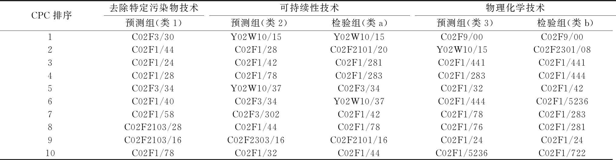 CPC排序去除特定污染物技术预测组(类1)可持续性技术预测组(类2)检验组(类a)物理化学技术预测组(类3)检验组(类b)1C02F3/30Y02W10/15Y02W10/15C02F9/00C02F9/002C02F1/44C02F1/28C02F2101/20Y02W10/15C02F2301/083C02F1/24C02F1/42C02F1/281C02F1/441C02F1/4414C02F1/28C02F1/78C02F1/283C02F1/283C02F1/4445C02F3/34Y02W10/37C02F3/34C02F1/32C02F1/426C02F1/40C02F3/34Y02W10/37C02F1/444C02F1/52367C02F1/58C02F3/302C02F1/42C02F1/78C02F1/2838C02F2103/28C02F1/44C02F1/78C02F1/76C02F1/2819C02F2103/16C02F2303/16C02F2101/16C02F1/24C02F1/2410C02F1/78C02F1/32C02F1/44C02F1/5236C02F1/722