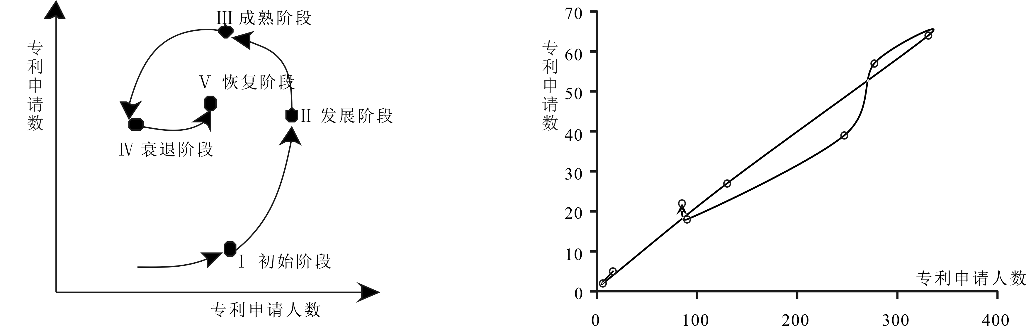 本文根据属于特定技术类别的专利申请人数与专利申请数之间的关系,将技术发展划分为5个阶段[11]。其中,第一阶段为引入阶段,在该阶段新技术刚诞生,专利申请人数和专利申请数很少。第二阶段为发展阶段,研发活动较为活跃,行业进入者增多,专利数和申请人数迅速增长。第三阶段为成熟阶段,市场已产生主流技术范式,研发活动大大减少,专利申请数增长速度放缓,申请人数量减少。此时,技术商业价值下降,技术领域已不具有发展潜力。第四阶段为衰退期,专利数和申请人数呈下降趋势,技术逐渐被淘汰。第五阶段为恢复期,基于基础技术的新技术出现,市场逐渐恢复并进入下一个循环期。
