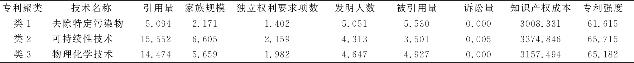 专利聚类技术名称引用量家族规模独立权利要求项数发明人数被引用量诉讼量知识产权成本专利强度类1去除特定污染物5.0942.1711.4025.0515.5300.0003008.33161.615类2可持续性技术15.5526.6052.1594.3133.5010.0053374.84665.715类3物理化学技术14.4745.6591.9824.6474.9270.0003157.49465.182