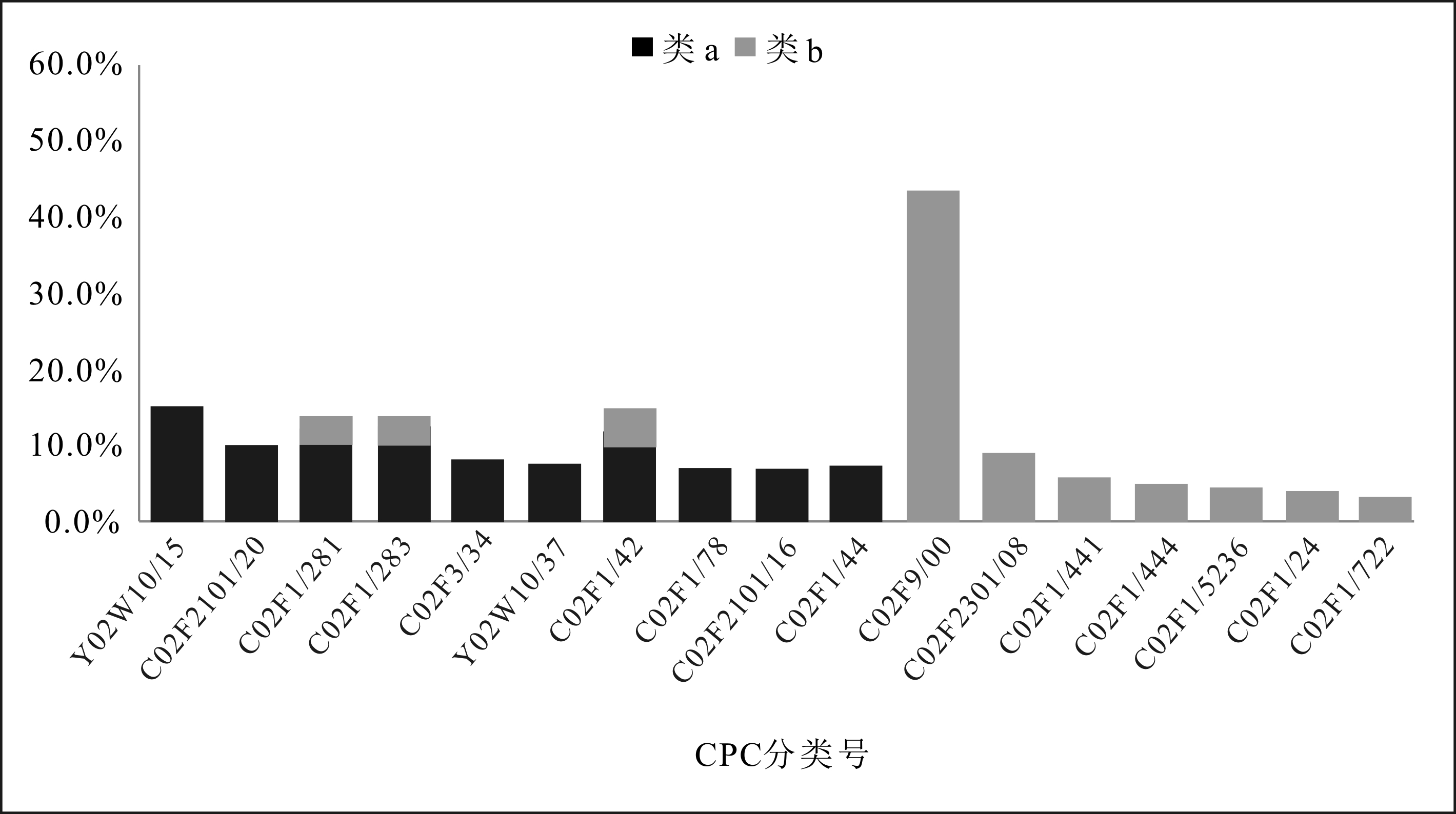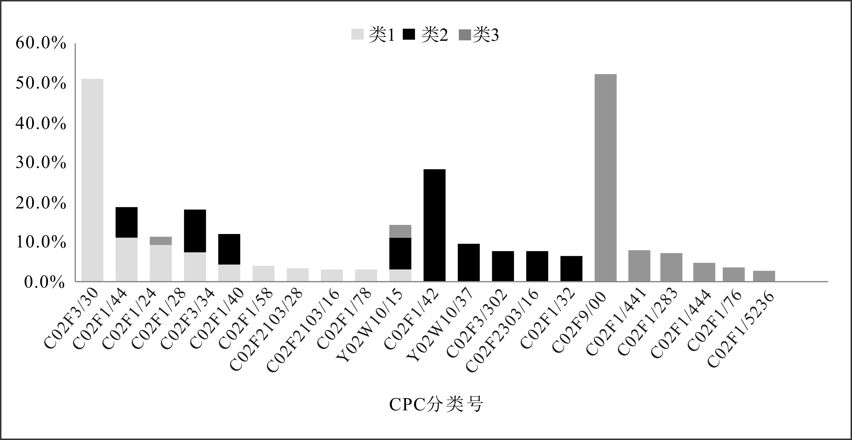 需要说明的是,部分CPC重复出现在多个专利类别中,但特定CPC在不同专利类别中所占比重不同,如图5、图6所示。其中,横坐标轴代表CPC分类号,纵坐标轴代表CPC分类号分别在3类技术中所占的比重。由于存在某些复杂技术,从技术原理上来说包含多个技术类别,且技术之间常具有互补性,如在某些水处理系统中其作为主要处理技术,而在其它处理系统中则作为预处理技术而存在,因此需要考虑技术之间的重合性。