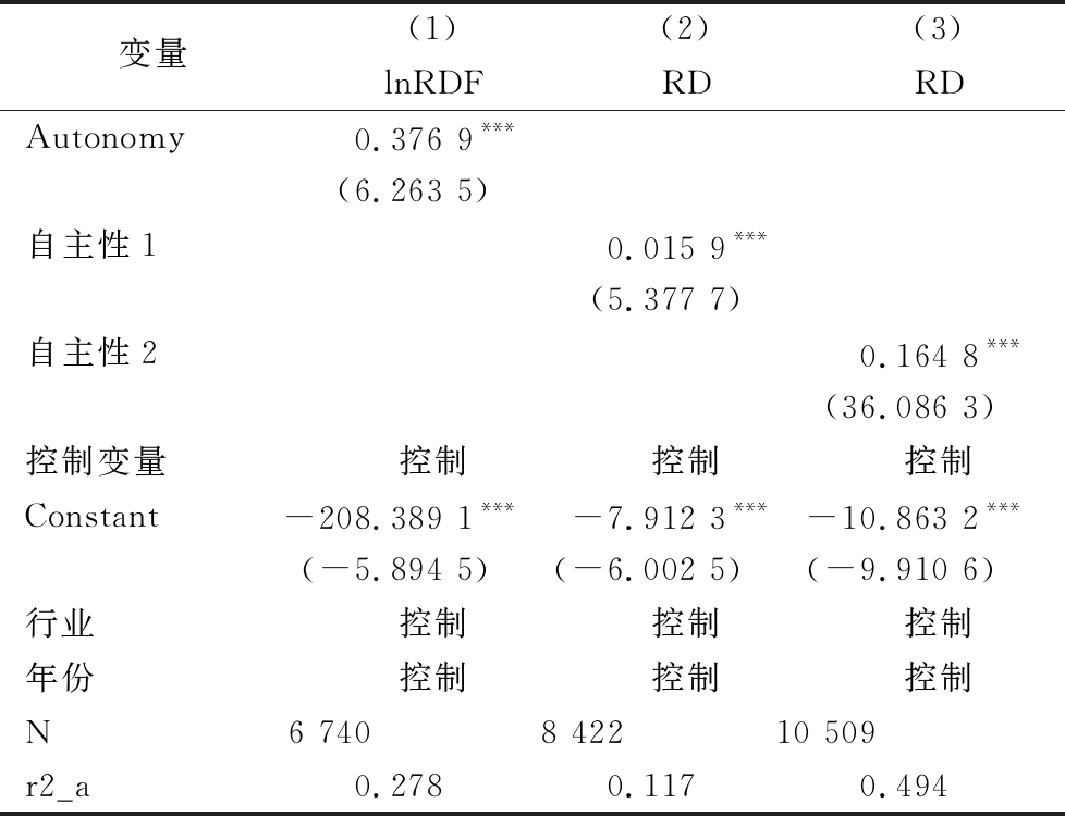 变量(1)(2)(3)lnRDFRDRDAutonomy0.376 9***(6.263 5)自主性10.015 9***(5.377 7)自主性20.164 8***(36.086 3)控制变量控制控制控制Constant-208.389 1***-7.912 3***-10.863 2***(-5.894 5)(-6.002 5)(-9.910 6)行业控制控制控制年份控制控制控制N6 7408 42210 509r2_a0.2780.1170.494