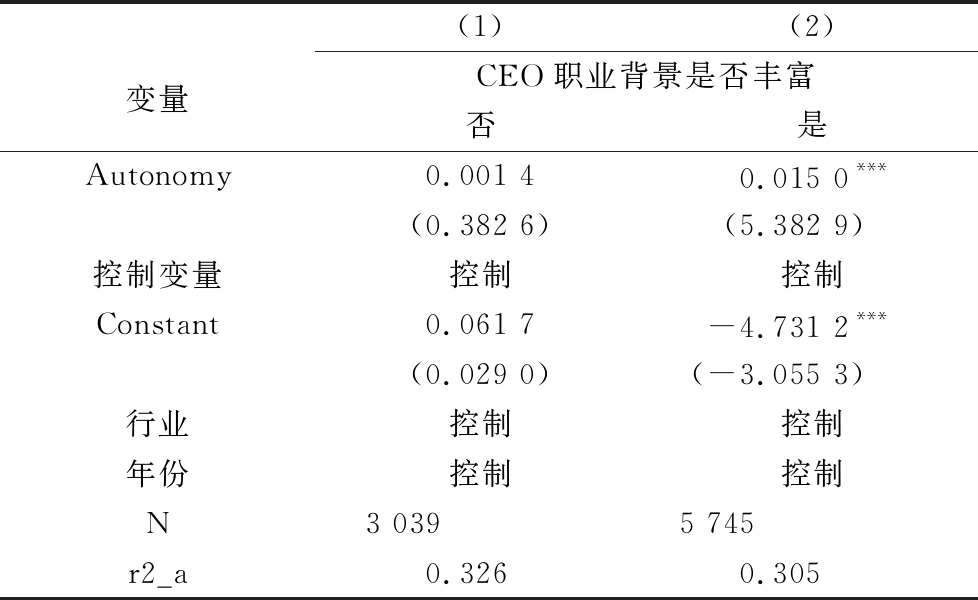 变量(1)(2)CEO职业背景是否丰富否是Autonomy0.001 40.015 0***(0.382 6)(5.382 9)控制变量控制控制Constant0.061 7-4.731 2***(0.029 0)(-3.055 3)行业控制控制年份控制控制N3 0395 745r2_a0.3260.305