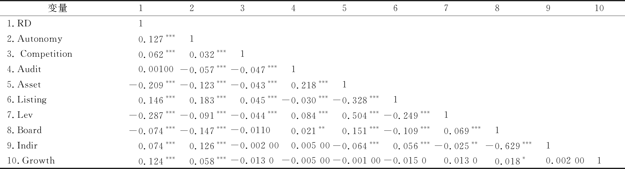 变量123456789101.RD12.Autonomy0.127***13. Competition0.062***0.032***14.Audit0.00100-0.057***-0.047***15.Asset-0.209***-0.123***-0.043***0.218***16.Listing0.146***0.183***0.045***-0.030***-0.328***17.Lev-0.287***-0.091***-0.044***0.084***0.504***-0.249***18.Board-0.074***-0.147***-0.01100.021**0.151***-0.109***0.069***19.Indir0.074***0.126***-0.002 000.005 00-0.064***0.056***-0.025**-0.629***110.Growth0.124***0.058***-0.013 0-0.005 00-0.001 00-0.015 00.013 00.018*0.002 001