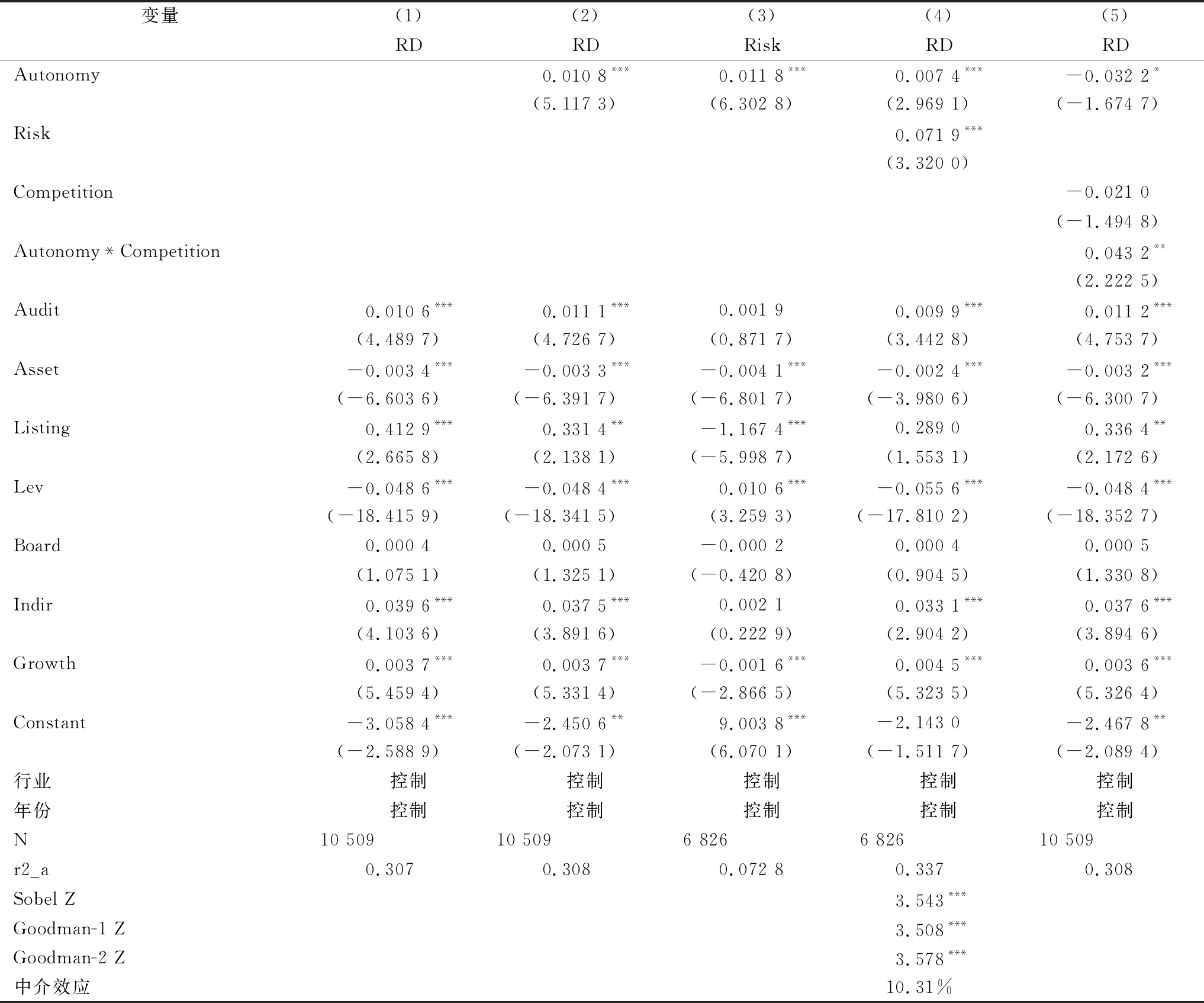 变量(1)(2)(3)(4)(5)RDRDRiskRDRDAutonomy0.010 8***0.011 8***0.007 4***-0.032 2*(5.117 3)(6.302 8)(2.969 1)(-1.674 7)Risk0.071 9***(3.320 0)Competition-0.021 0(-1.494 8)Autonomy*Competition0.043 2**(2.222 5)Audit0.010 6***0.011 1***0.001 90.009 9***0.011 2***(4.489 7)(4.726 7)(0.871 7)(3.442 8)(4.753 7)Asset-0.003 4***-0.003 3***-0.004 1***-0.002 4***-0.003 2***(-6.603 6)(-6.391 7)(-6.801 7)(-3.980 6)(-6.300 7)Listing0.412 9***0.331 4**-1.167 4***0.289 00.336 4**(2.665 8)(2.138 1)(-5.998 7)(1.553 1)(2.172 6)Lev-0.048 6***-0.048 4***0.010 6***-0.055 6***-0.048 4***(-18.415 9)(-18.341 5)(3.259 3)(-17.810 2)(-18.352 7)Board0.000 40.000 5-0.000 20.000 40.000 5(1.075 1)(1.325 1)(-0.420 8)(0.904 5)(1.330 8)Indir0.039 6***0.037 5***0.002 10.033 1***0.037 6***(4.103 6)(3.891 6)(0.222 9)(2.904 2)(3.894 6)Growth0.003 7***0.003 7***-0.001 6***0.004 5***0.003 6***(5.459 4)(5.331 4)(-2.866 5)(5.323 5)(5.326 4)Constant-3.058 4***-2.450 6**9.003 8***-2.143 0-2.467 8**(-2.588 9)(-2.073 1)(6.070 1)(-1.511 7)(-2.089 4)行业控制控制控制控制控制年份控制控制控制控制控制N10 50910 5096 8266 82610 509r2_a0.3070.3080.072 80.3370.308Sobel Z3.543***Goodman-1 Z3.508***Goodman-2 Z3.578***中介效应10.31%