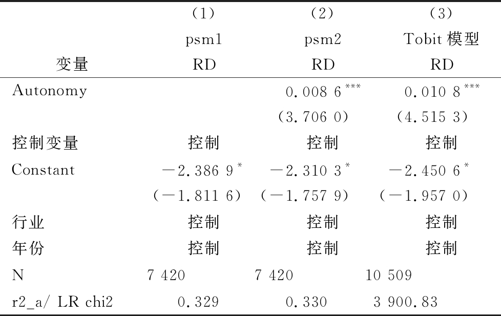 (1)(2)(3)psm1psm2Tobit模型变量RDRDRDAutonomy0.008 6***0.010 8***(3.706 0)(4.515 3)控制变量控制控制控制Constant-2.386 9*-2.310 3*-2.450 6*(-1.811 6)(-1.757 9)(-1.957 0)行业控制控制控制年份控制控制控制N7 4207 42010 509r2_a/ LR chi20.3290.3303 900.83
