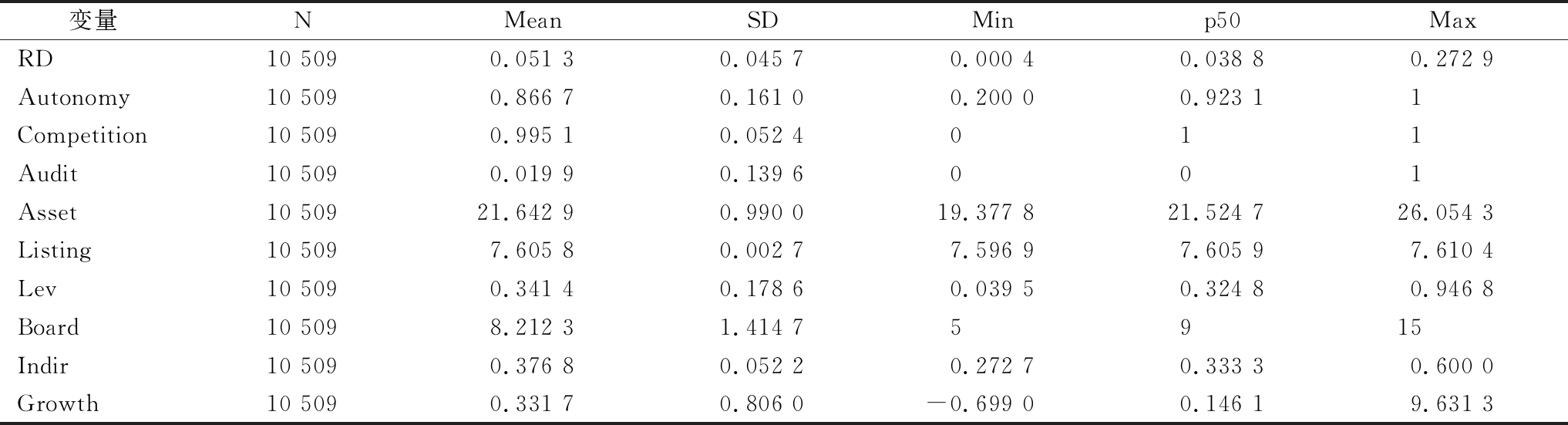 变量NMeanSDMinp50MaxRD10 5090.051 30.045 70.000 40.038 80.272 9Autonomy10 5090.866 70.161 00.200 00.923 11Competition10 5090.995 10.052 4011Audit10 5090.019 90.139 6001Asset10 50921.642 90.990 019.377 821.524 726.054 3Listing10 5097.605 80.002 77.596 97.605 97.610 4Lev10 5090.341 40.178 60.039 50.324 80.946 8Board10 5098.212 31.414 75915Indir10 5090.376 80.052 20.272 70.333 30.600 0Growth10 5090.331 70.806 0-0.699 00.146 19.631 3