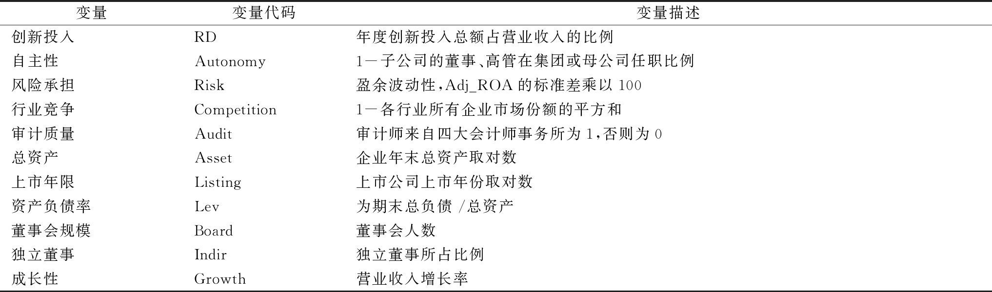 (5)控制变量。借鉴现有子公司自主性[40-41]与创新投入[42]相关文献,选取以下控制变量,具体包括:①审计质量(Audit),若审计师来自四大会计师事务所则取值为1,否则为0;②总资产(Asset),为企业年末总资产取对数;③上市年限(Listing),为上市公司上市年份取对数;④资产负债率(LEV),为期末总负债/总资产;⑤董事会规模(Board),采用董事会人数衡量;⑥独立董事(Indir),采用独立董事所占比例衡量;⑦成长性(Growth),采用营业收入增长率衡量。同时,本文对行业和年份进行控制。各变量汇总情况如表1所示。