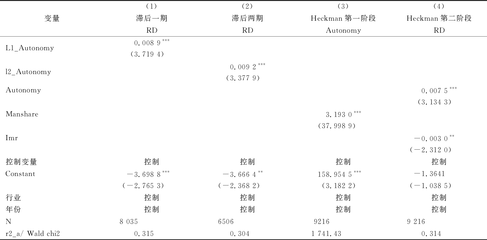 (1)(2)(3)(4)变量滞后一期滞后两期Heckman第一阶段Heckman第二阶段RDRDAutonomyRDL1_Autonomy0.008 9***(3.719 4)l2_Autonomy0.009 2***(3.377 9)Autonomy0.007 5***(3.134 3)Manshare3.193 0***(37.998 9)Imr-0.003 0**(-2.312 0)控制变量控制控制控制控制Constant-3.698 8***-3.666 4**158.954 5***-1.3641(-2.765 3)(-2.368 2)(3.182 2)(-1.038 5)行业控制控制控制控制年份控制控制控制控制N8 035650692169 216r2_a/ Wald chi20.3150.3041 741.430.314