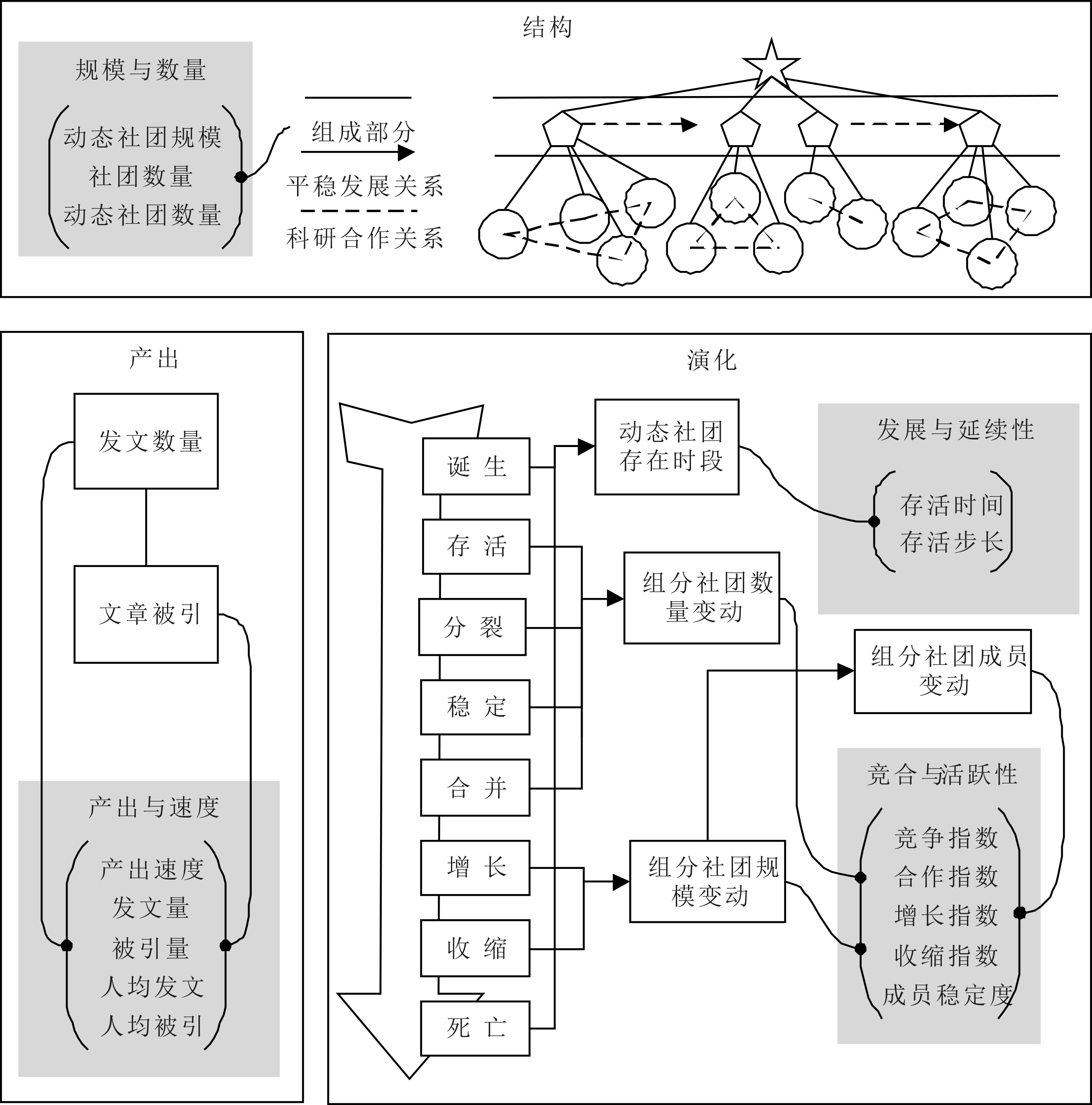 结构用来表征动态社团中的学者及其科研合作关系,是基础研究动态社团演化的基础;演化是指动态社团在发展过程中发生的各种演化事件;而产出是指动态社团科研目标及科研成果。本文从结构、演化和产出[34]3个方面对动态社团演化规律进行分析。具体来说,本研究运用结构模型法,从分解角度深入剖析动态社团的结构特征指标;基于动态社团生命周期发生的演化事件,从行为角度提取特征指标描述动态社团行为变化情况;依据科学计量学理论,提取特征指标度量动态社团科研成果产出情况。动态社团演化特征指标识别过程如图3所示。