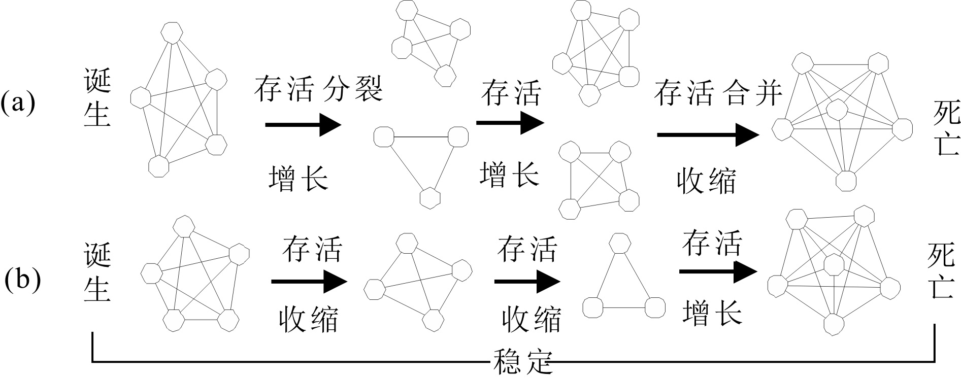 本文构建动态社团生命周期演化模型,如图2所示。其中,(a)为未发生稳定事件的动态社团,包括诞生、存活、增长、分裂、合并、收缩和死亡7个事件;(b)为发生稳定事件的动态社团,包括诞生、存活、收缩、增长、死亡和稳定6个事件。