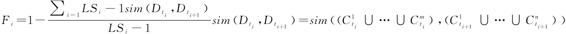 增长与收缩事件体现了组分社团规模变动情况,以规模增长指数、规模收缩指数两个指标表征。增长指数是指增长事件在动态社团中发生的次数,收缩指数是指收缩事件在动态社团中发生的次数。存活事件、组分社团数量变动和组分社团规模变动都伴随着组分社团成员变动,本文用成员稳定性测量,反映在动态社团Δi存活步长LSi内社团成员的稳定程度Fi,计算方法如下: