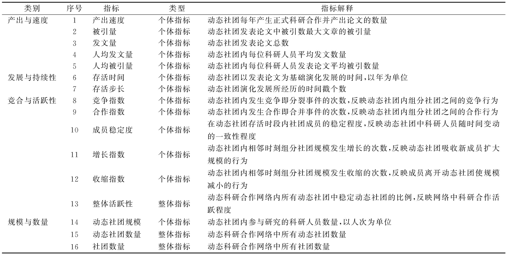 本文从基础研究动态社团结构、演化和产出3个方面提取16个动态社团特征指标,将其划分为产出与速度、发展与持续性、竞合与活跃性、规模与数量4类,如表1所示。其中,个体指标为度量单个动态社团的特征指标,整体指标为度量网络中所有动态社团整体状态的特征指标,相关指标识别过程见图3。