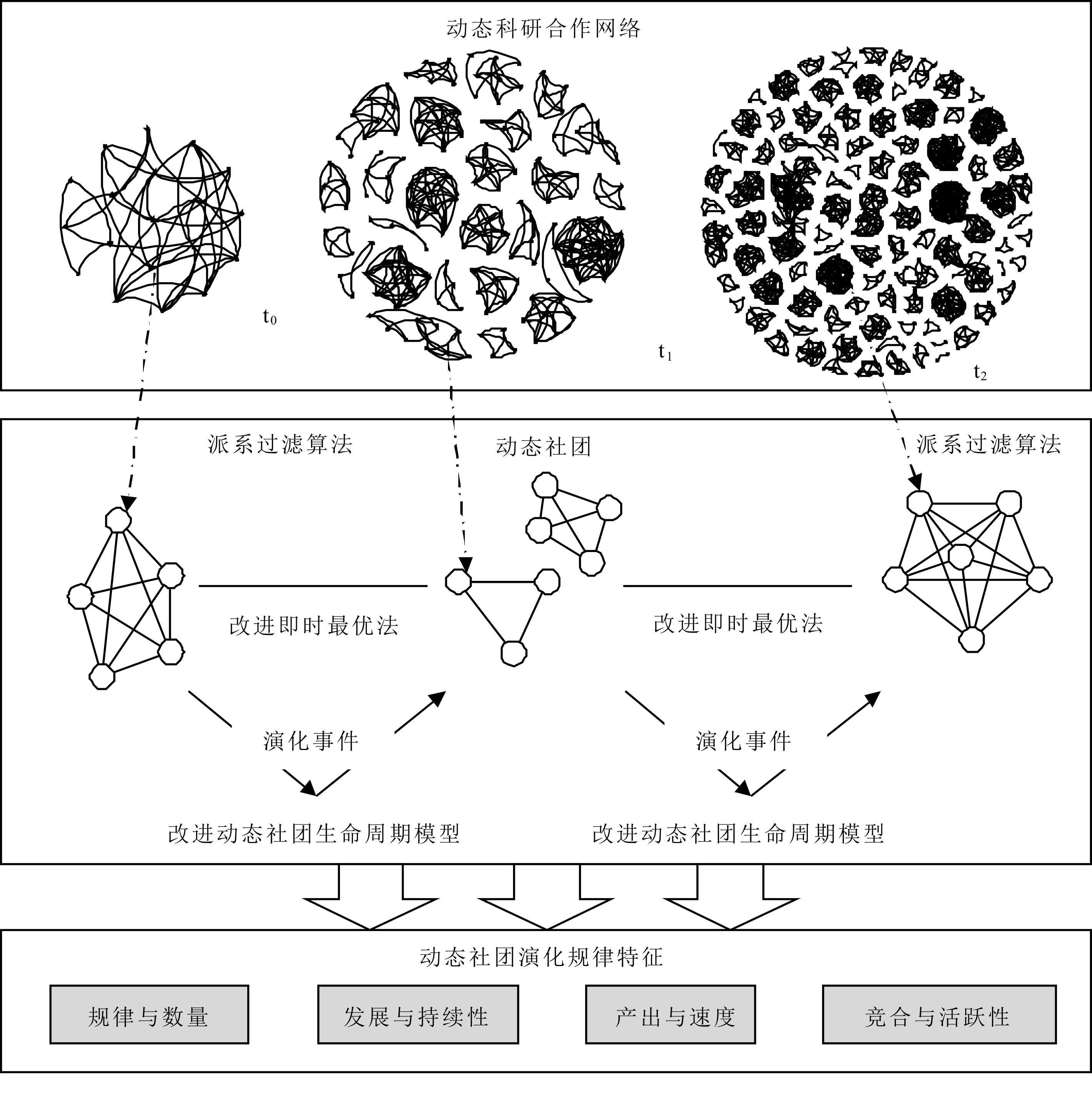 社团是指网络中内部密集连接而外部松散连接的节点与关系的子集[24]。即时最优法(Instant-optimal Method)是一种较为成熟的动态社团发现方法,其原理主要基于两个步骤:一是在每个网络快照中发现静态社团;二是将该时间戳中的所有社团与其它时间戳社团进行匹配,匹配度大于特定阈值即构成动态社团[25]。该方法来源于Toyoda & Kitsuregawa[26]早期提出的分析框架,此后学者进行了改进[27],并界定了其在演化过程中所发生的诞生、成长、收缩、合并、分裂和死亡[28]等事件,这种以人口规律描述社团演化的方法称为生命周期模型[29-30],拓展了社团演化研究方法。因此,本研究首先基于派系过滤算法,在动态科研合作网络快照上挖掘静态社团;其次,基于社会分层理论和帕累托法则改进即时最优法,识别关键学者在动态社团演化中所发挥的作用,跨时间戳挖掘动态社团,使模型更加符合科学共同体演化规律和科研团队传承实际情况;再次,基于竞合理论改进动态社团演化过程生命周期模型[23],增加稳定事件以更好地描述动态社团科研合作竞争与合作行为活跃程度;最后,基于系统理论与竞合理论,从结构、演化和产出3个方面剖析动态社团演化机理并提取16个动态社团特征指标,将其划分为规模与数量、产出与速度、发展与持续性、竞合与活跃性4类,可对基础研究动态社团发展和科技人才队伍建设提供理论支撑,研究框架如图1所示。