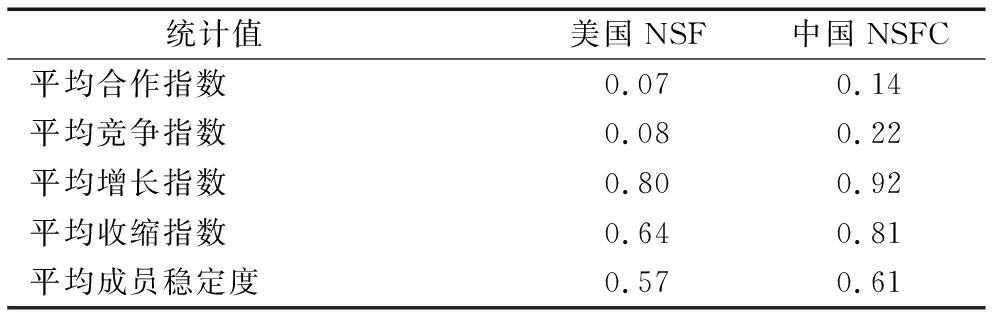 统计值 美国NSF中国NSFC平均合作指数0.070.14平均竞争指数0.080.22平均增长指数0.800.92平均收缩指数0.640.81平均成员稳定度0.570.61