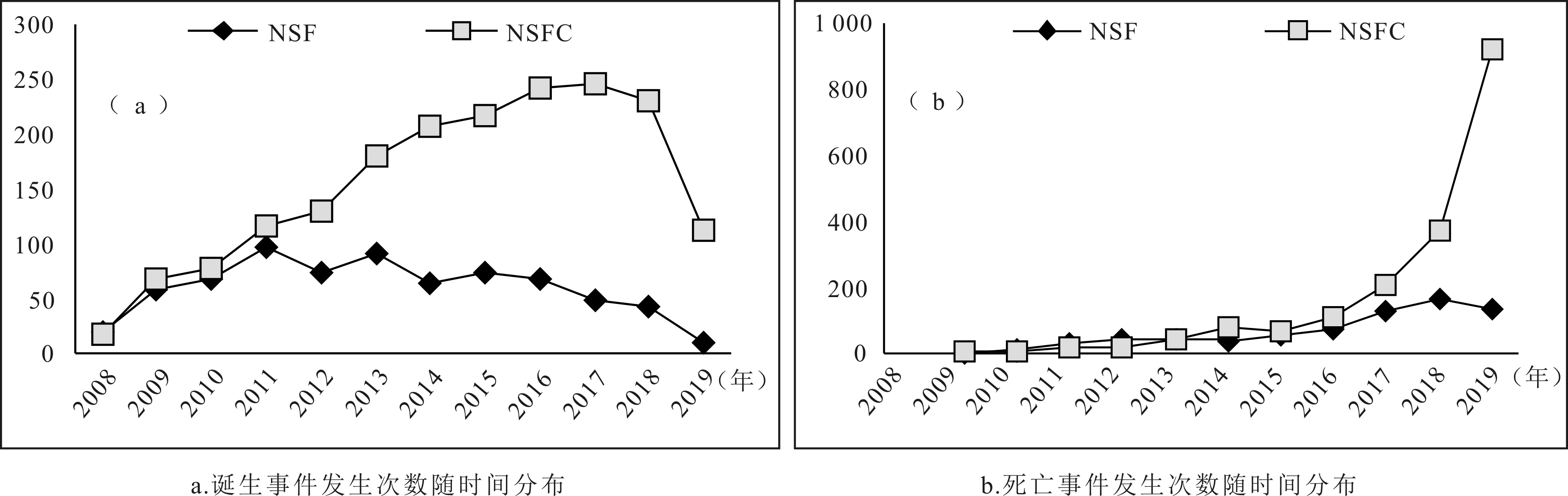图4 动态社团诞生、死亡事件发生次数随时间分布
