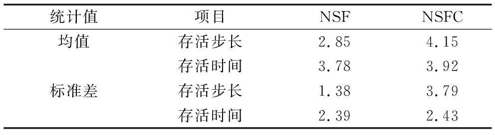 统计值项目NSFNSFC均值存活步长2.854.15存活时间3.783.92标准差存活步长1.383.79存活时间2.392.43