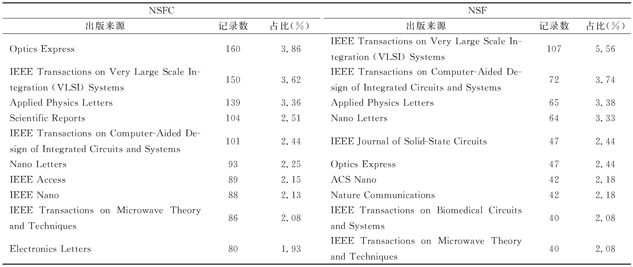 NSFC出版来源记录数占比(%)NSF出版来源记录数占比(%)Optics Express1603.86IEEE Transactions on Very Large Scale In-tegration (VLSI) Systems1075.56IEEE Transactions on Very Large Scale In-tegration (VLSI) Systems1503.62IEEE Transactions on Computer-Aided De-sign of Integrated Circuits and Systems723.74Applied Physics Letters1393.36Applied Physics Letters653.38Scientific Reports1042.51Nano Letters643.33IEEE Transactions on Computer-Aided De-sign of Integrated Circuits and Systems1012.44IEEE Journal of Solid-State Circuits472.44Nano Letters932.25Optics Express472.44IEEE Access892.15ACS Nano422.18IEEE Nano882.13Nature Communications422.18IEEE Transactions on Microwave Theory and Techniques862.08IEEE Transactions on Biomedical Circuits and Systems402.08Electronics Letters801.93IEEE Transactions on Microwave Theory and Techniques402.08