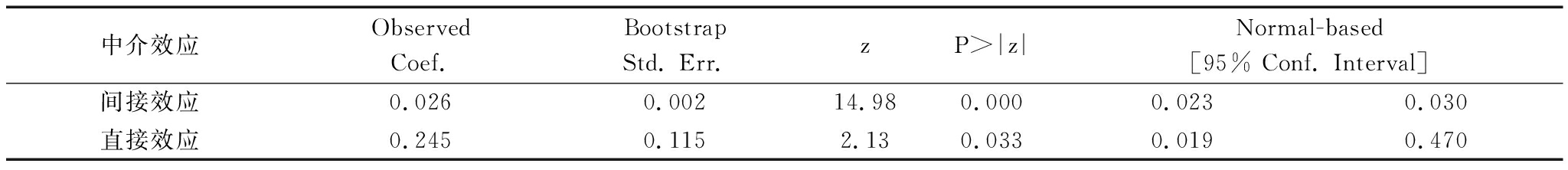 中介效应Observed Coef.Bootstrap Std. Err.zP>|z|Normal-based [95% Conf. Interval]间接效应0.0260.00214.980.0000.0230.030直接效应0.2450.1152.130.0330.0190.470