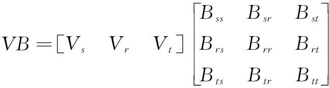 同样,中间产品也可以按照增加值来源不同和最终使用地不同进行分解。首先定义增加值系数Vs≡VAs(Cs)-1,同理可得Vr、Vt,增加值系数矩阵为: