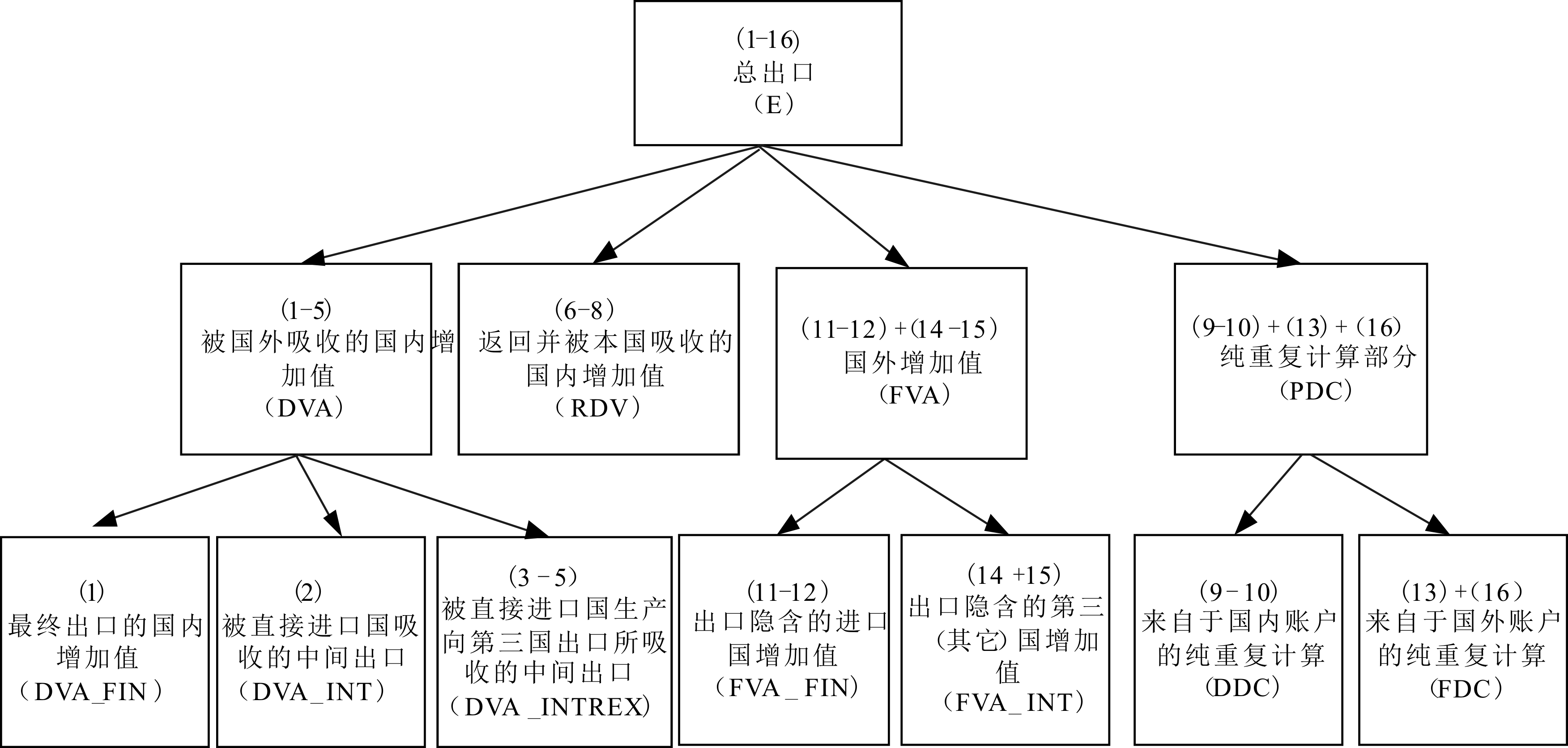 上式将增加值系数代入国际中间产品分解中,根据出口增加值和最终使用地分为16个增加值和重复计算部分,总贸易核算法结构见图1。