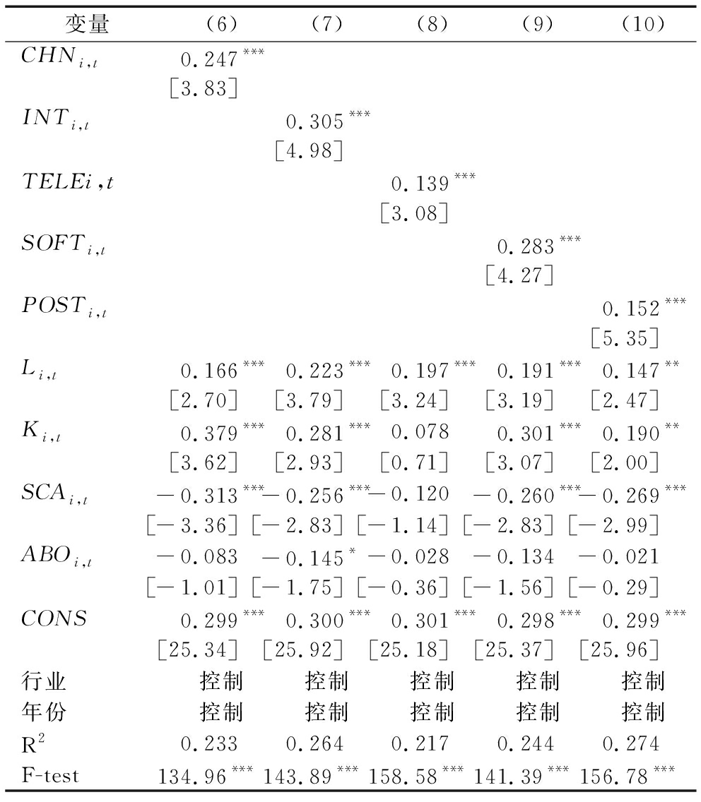 变量(6)(7)(8)(9)(10)CHNi,t0.247***[3.83]INTi,t0.305***[4.98]TELEi,t0.139***[3.08]SOFTi,t0.283***[4.27]POSTi,t0.152***[5.35]Li,t0.166***0.223***0.197***0.191***0.147**[2.70][3.79][3.24][3.19][2.47]Ki,t0.379***0.281***0.0780.301***0.190**[3.62][2.93][0.71][3.07][2.00]SCAi,t-0.313***-0.256***-0.120-0.260***-0.269***[-3.36][-2.83][-1.14][-2.83][-2.99]ABOi,t-0.083-0.145*-0.028-0.134-0.021[-1.01][-1.75][-0.36][-1.56][-0.29]CONS0.299***0.300***0.301***0.298***0.299***[25.34][25.92][25.18][25.37][25.96]行业控制控制控制控制控制年份控制控制控制控制控制R20.2330.2640.2170.2440.274F-test134.96***143.89***158.58***141.39***156.78***