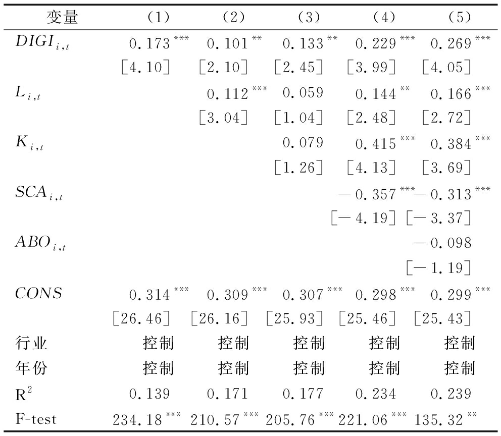 变量(1)(2)(3)(4)(5)DIGIi,t0.173***0.101**0.133**0.229***0.269***[4.10][2.10][2.45][3.99][4.05]Li,t0.112***0.0590.144**0.166***[3.04][1.04][2.48][2.72]Ki,t0.0790.415***0.384***[1.26][4.13][3.69]SCAi,t-0.357***-0.313***[-4.19][-3.37]ABOi,t-0.098[-1.19]CONS0.314***0.309***0.307***0.298***0.299***[26.46][26.16][25.93][25.46][25.43]行业控制控制控制控制控制年份控制控制控制控制控制R20.1390.1710.1770.2340.239F-test234.18***210.57***205.76***221.06***135.32**